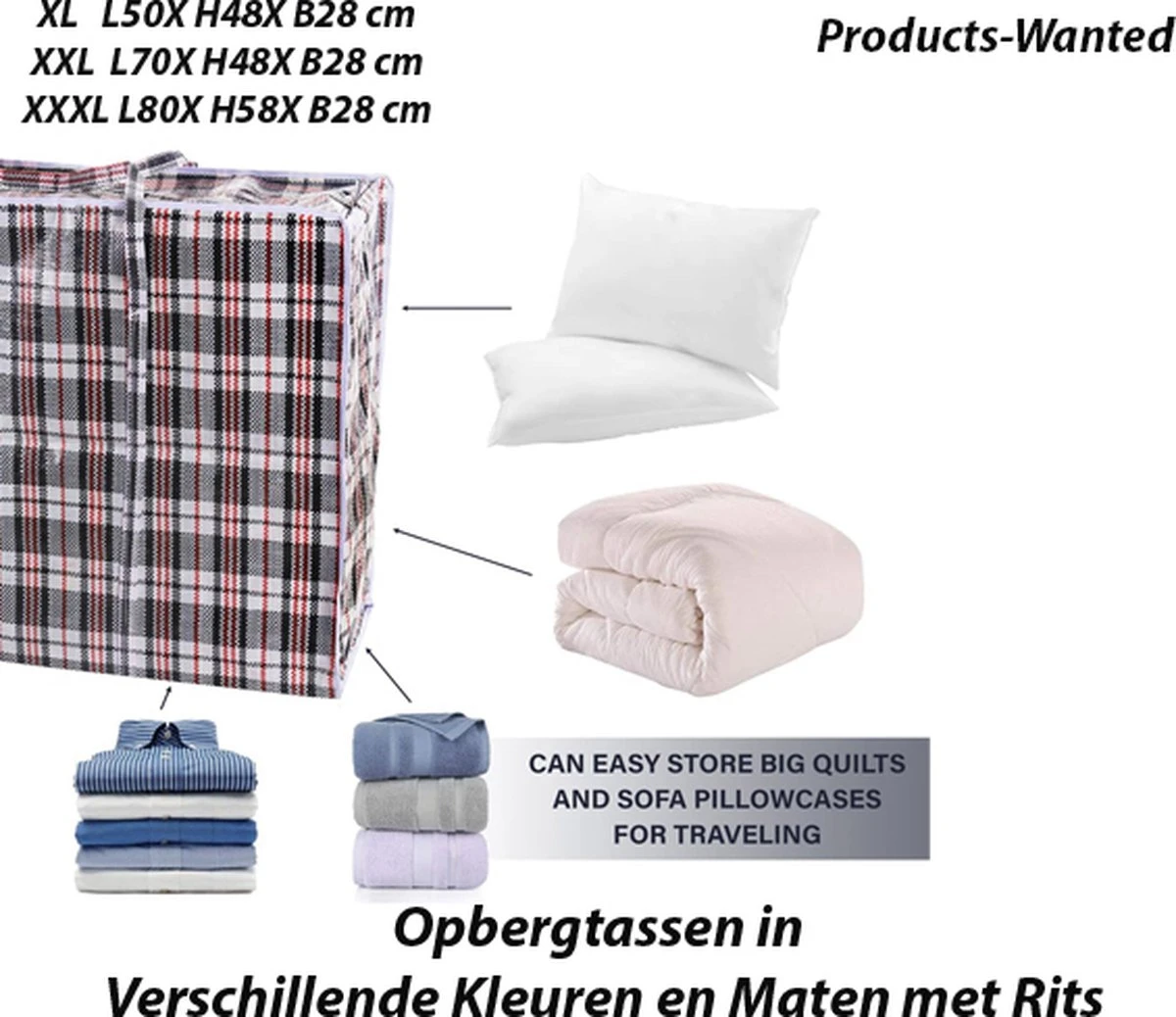 Highlights: * 10-Stuks XXL Verhuistassen en Reistassen in Verschillende Kleuren met Rits * Gemaakt van stevig polypropyleen, vochtdicht en bijna niet kapot te krijgen * Veelzijdig te gebruiken als boodschappen, opberg of reistas * Multifunctioneel * Geweldige oplossing voor het opbergen van kerstdecoraties, kerstboom, dekbedden, handdoeken, speelgoed, winterkleding en reserveonderdelen, gordijnen, kussens, babykleding, sporttoestellen, laundry bag en extra opbergmogelijkheden voor de keuken of als onderbed * Sterk en duurzaam * Handig in gebruik * Opvouwbaar * Waterafstotend * Lichtgewicht * Geweven plastic PVC * Mix kleuren geleverd (zwart, blauw en rood ) * L70X H48X B28 cm XXL105 Liter Met deze tassen kun je echt van alles. Je kunt er een grote boodschap mee doen. Winterkleding, gordijnen, winterdekens, kussens, handdoeken, kampeerspullen, slaapzakken en nog veel meer opbergen of verhuizen. Je kunt de tas gemakkelijk achterin de auto zetten als je op vakantie gaat. Met de stevige ritssluiting is de tas goed af te sluiten en zitten je spullen goed opgeborgen. Eenvoudig op te bergen en kan probleemloos worden gebruikt als opbergtas met ritssluiting onder het bed, in een kledingkast, zolder, garage of bergruimte, als opbergbox voor kleding en schoenen onder het bed en dankzij de comfortabele lange handgrepen kan hij gemakkelijk als grote boodschappentas worden opgevouwen voor grote boodschappen