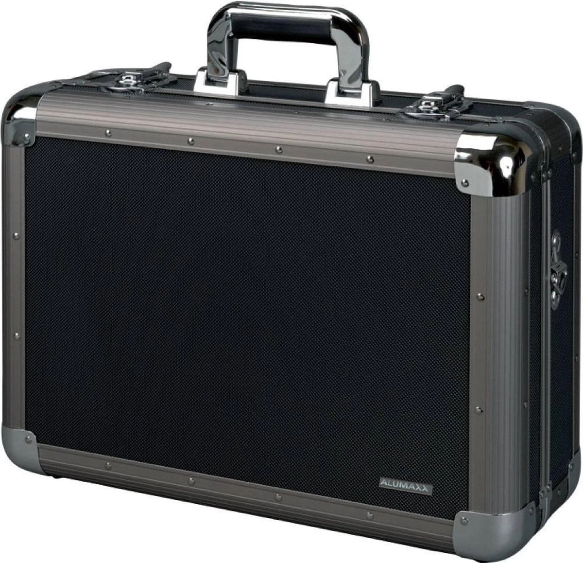 Multifunctionele koffer Alumaxx Explorer aluminium zwart met verstevigde randen, afneembare schouderriem, Heavy-Duty-Grip, 2 veiligheidssloten. Binnenafwerking: schuimrubber in het deksel, verwijderbare en uitgestanste schuimrubber (7cm), vijf PVC-vakken voor de individuele behoeften. Afmeting 34,5x46x16cm.