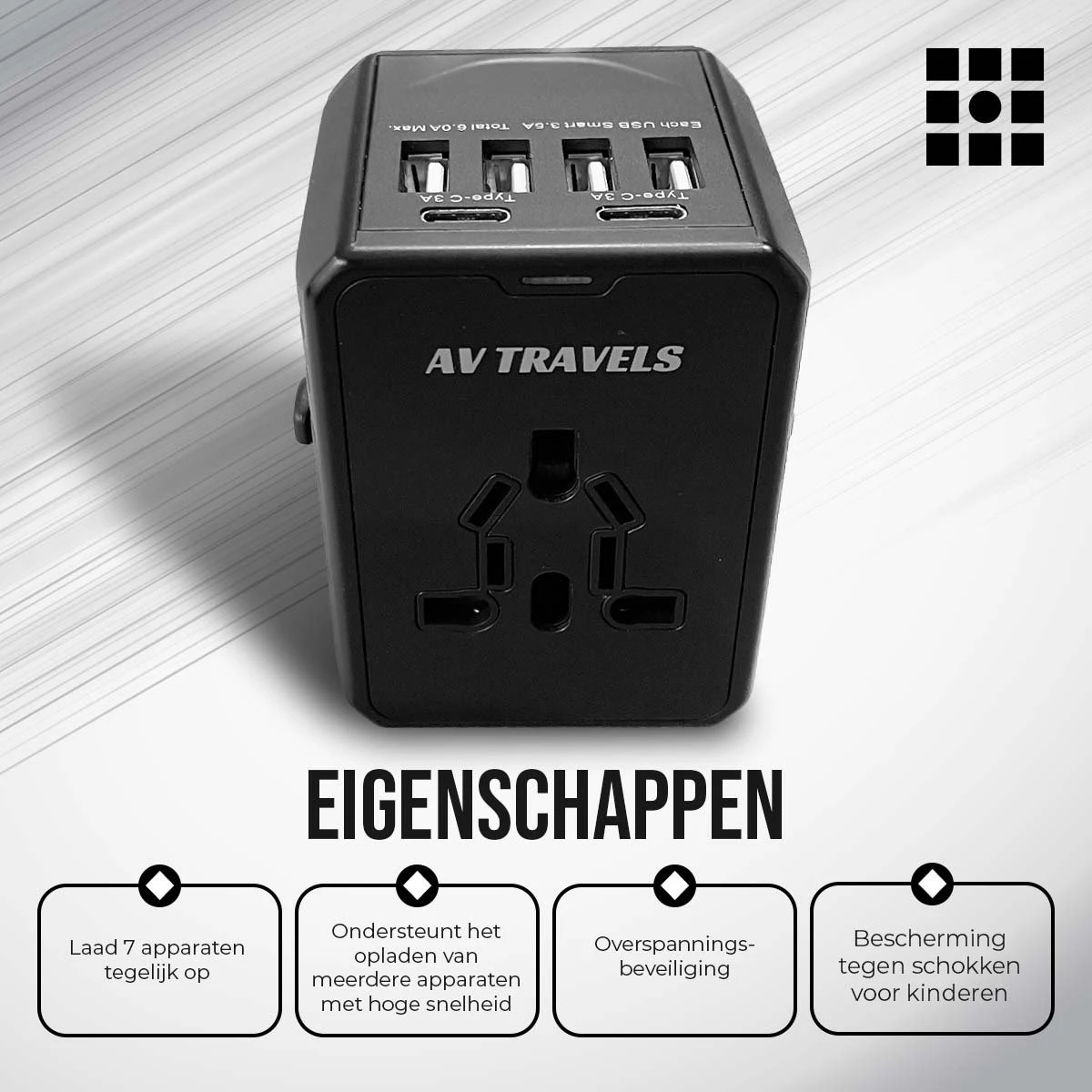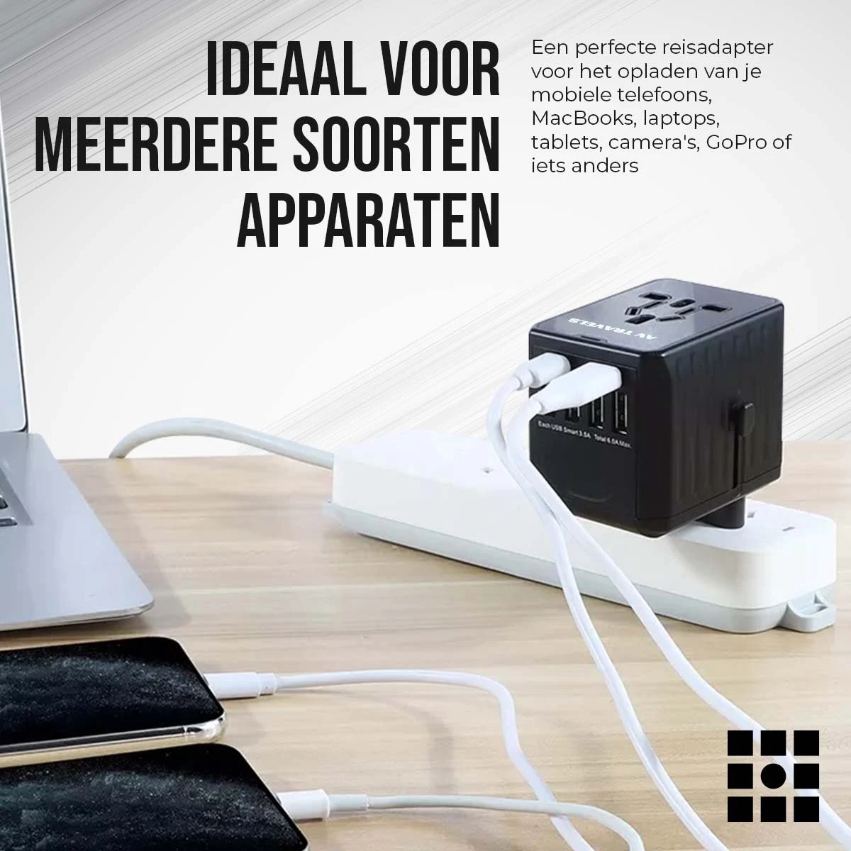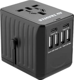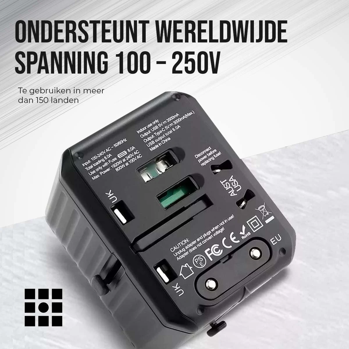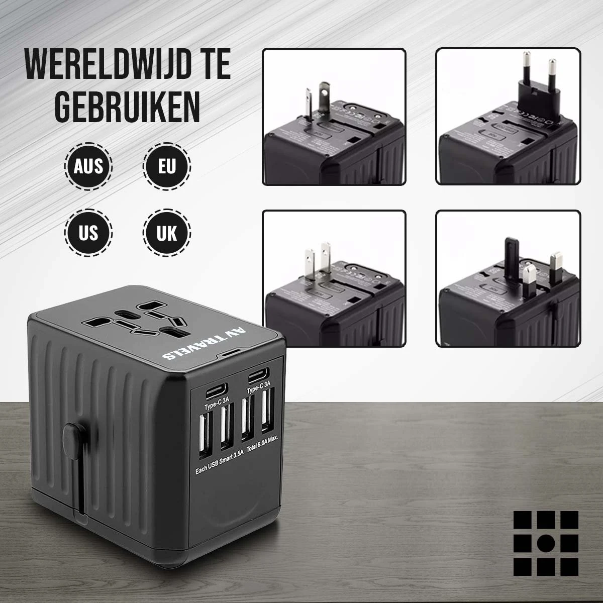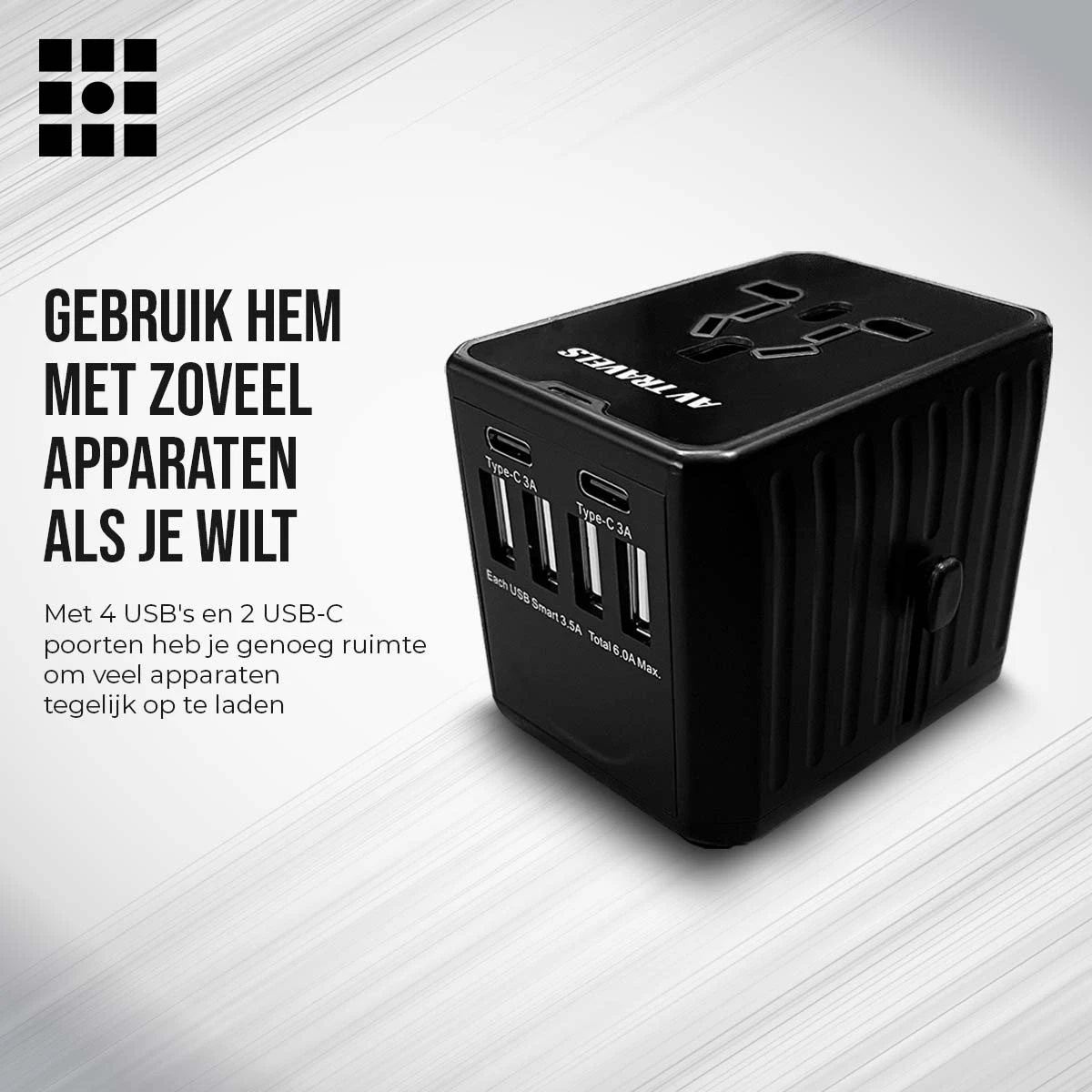 De universele werelstekker beschikt over 6 USB poorten waaronder 4 USB en 2 USB-c poorten. Hierdoor heb je de mogelijkheid om jouw elektronische apparaten supersnel op te laden met de reisstekker. Zo kan je ten volste genieten van je reis met volledig opgeladen toestellen.