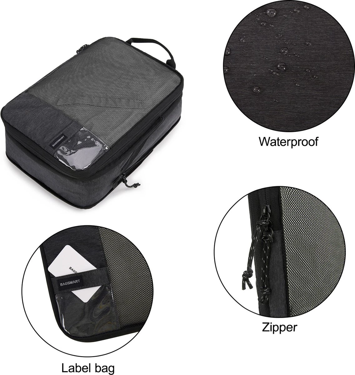 - Uniek ontwerp met labels. Aan de buitenkant van elke packing cube is een klein transparant vakje voorzien voor kledinglabels of andere aanduidingen. Zo kan je duidelijk aantonen wat erin zit of van wie het is.