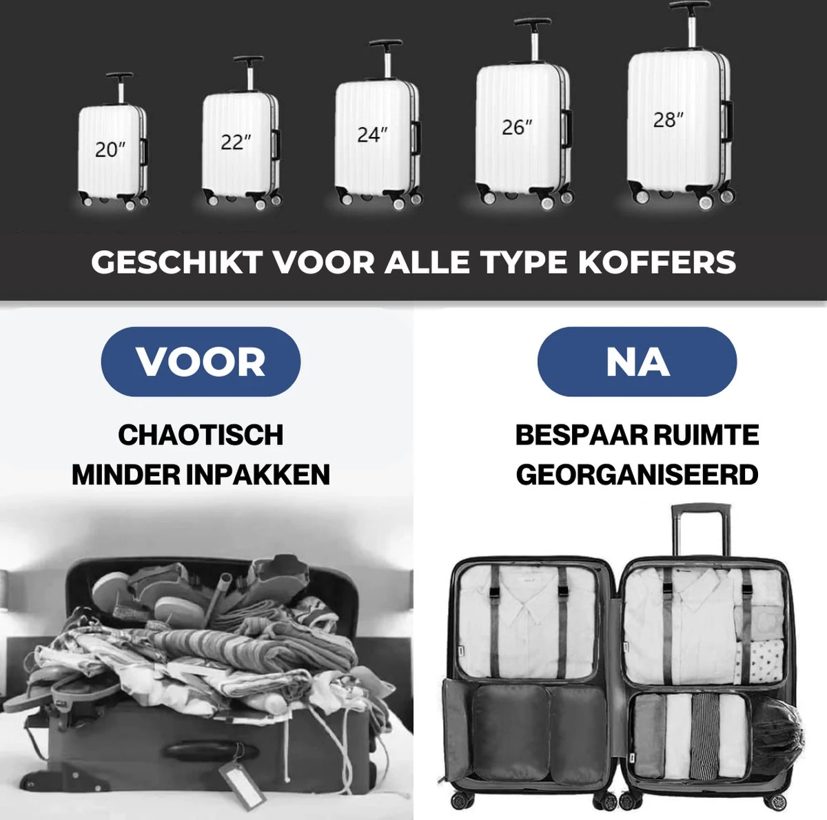 Dit is ideaal voor als je naar meerdere bestemmingen reist! Je hebt namelijk een stuk sneller al jouw spullen bij elkaar geraapt en ingepakt. Je kunt er namelijk ook voor kiezen om op reis jouw kleding in de zakken te houden en gewoon zo in de kast te leggen!