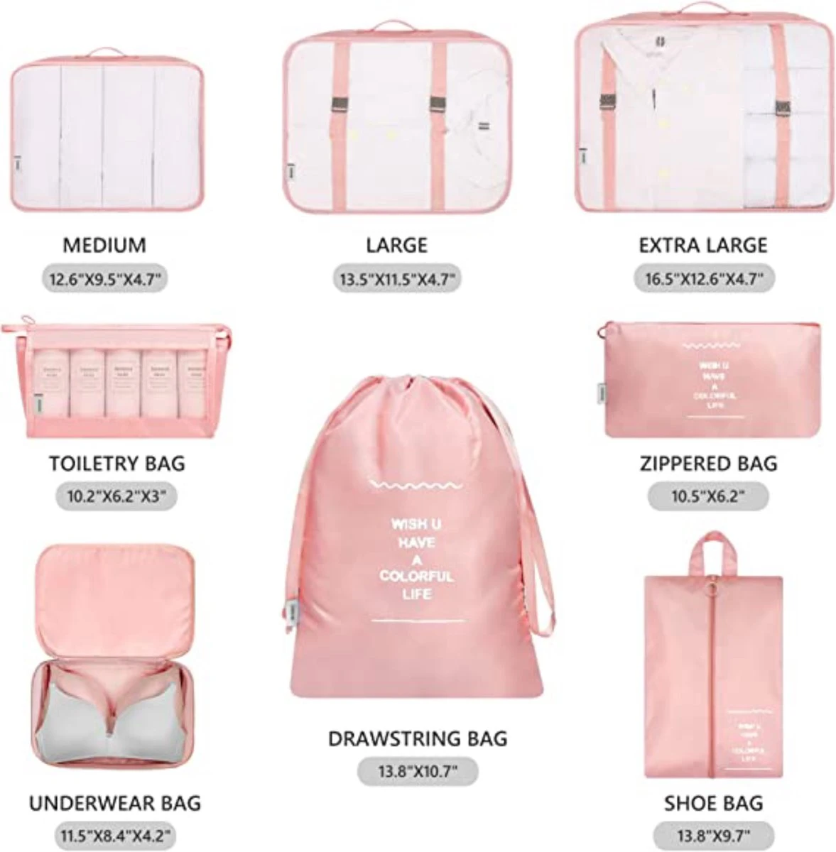 BOTC Packing Cubes Set 9-Delig: Inclusief 9 PCS Reis Bagage Organizers: Inclusief 3 verschillende maten van de verpakking kubussen organisatoren (groot: 10-12 overhemden, medium: 7-9 overhemden, klein: 5-6 overhemden), 1 beha ondergoed zak, 1 toilettas, 1 wasserij zak, 1 schoenen zak, Bagagelabel en 1 zak met rits. Gemakkelijk in te pakken uw alle bagage goed in uw 21-25 centimeter koffer, handbagage, lades en rugzak, geweldig voor korte of lange reis