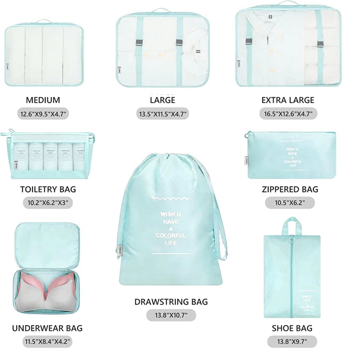 BOTC Packing Cubes Set 9-Delig: Inclusief 9 PCS Reis Bagage Organizers: Inclusief 3 verschillende maten van de verpakking kubussen organisatoren (groot: 10-12 overhemden, medium: 7-9 overhemden, klein: 5-6 overhemden), 1 beha ondergoed zak, 1 toilettas, 1 wasserij zak, 1 schoenen zak, Bagagelabel en 1 zak met rits. Gemakkelijk in te pakken uw alle bagage goed in uw 21-25 centimeter koffer, handbagage, lades en rugzak, geweldig voor korte of lange reis