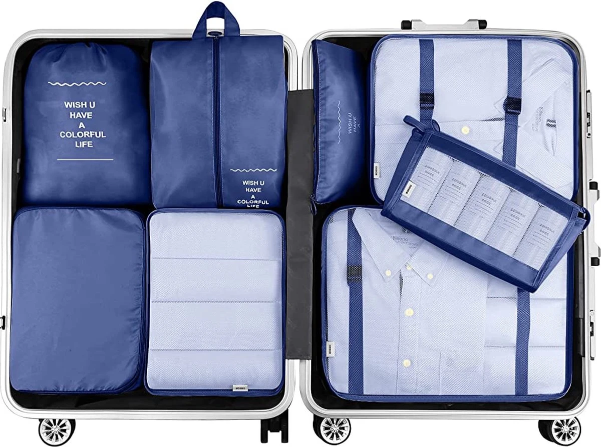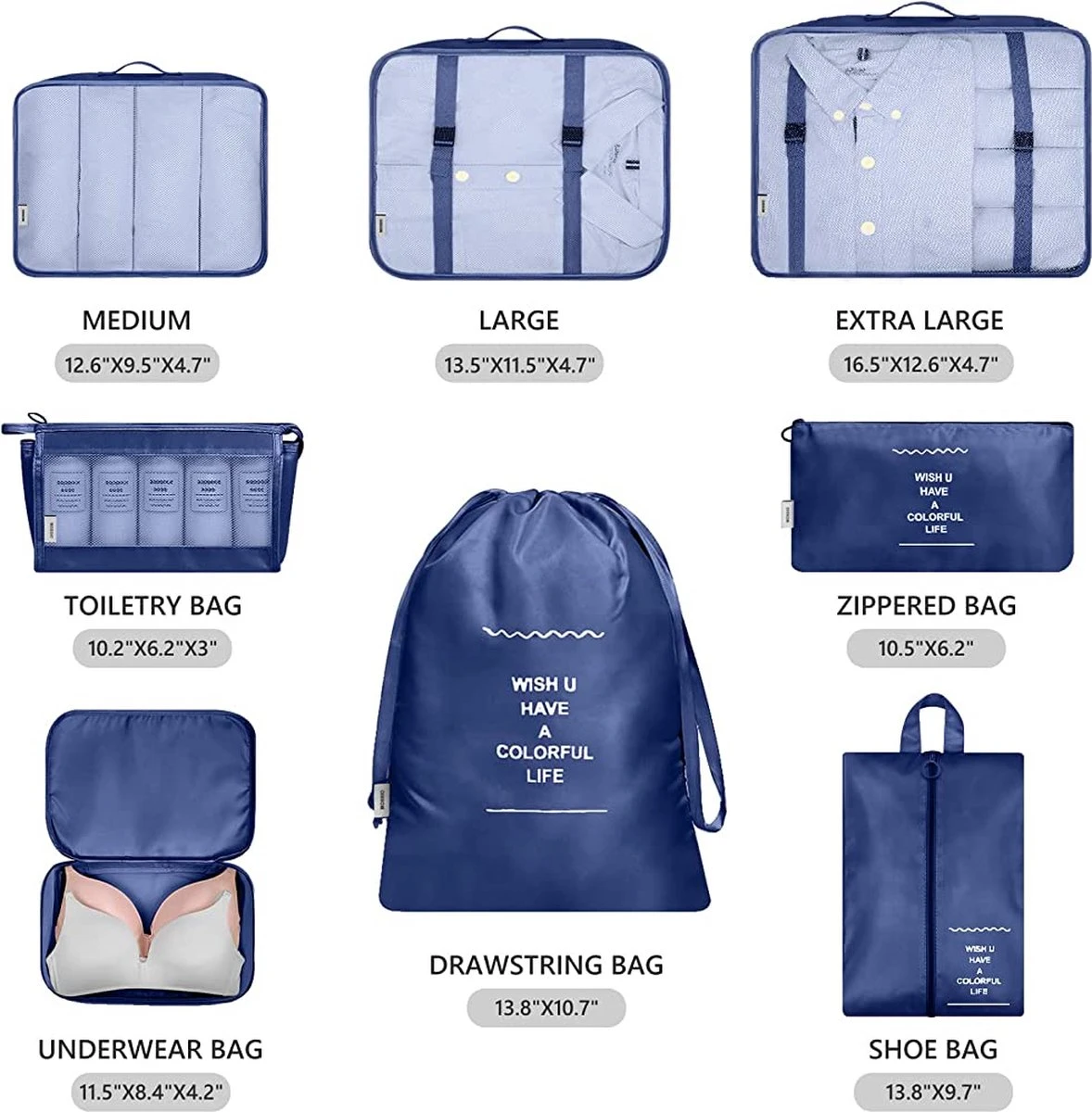 BOTC Packing Cubes Set 9-Delig: Inclusief 9 PCS Reis Bagage Organizers: Inclusief 3 verschillende maten van de verpakking kubussen organisatoren (groot: 10-12 overhemden, medium: 7-9 overhemden, klein: 5-6 overhemden), 1 beha ondergoed zak, 1 toilettas, 1 wasserij zak, 1 schoenen zak, Bagagelabel en 1 zak met rits. Gemakkelijk in te pakken uw alle bagage goed in uw 21-25 centimeter koffer, handbagage, lades en rugzak, geweldig voor korte of lange reis