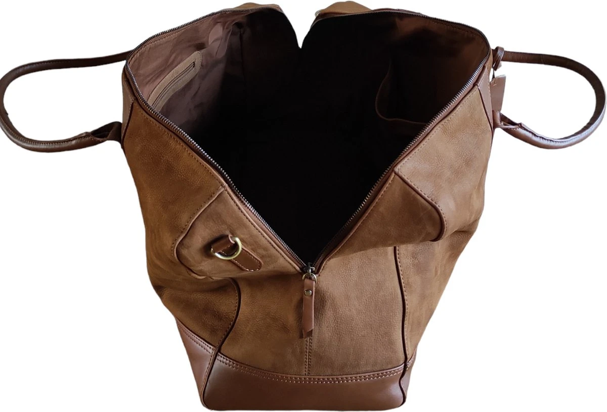 De tas is gemaakt van Nubuck in combinatie met Vegetable Tanned leer. Het formaat (49.5 x 32.5 x 22 cm) van de tas is ideaal tijdens weekendjes weg zodat je je belangrijkste spullen altijd bij je hebt. De tas heeft door de cognac kleur een stoere look waardoor hij ook unisex te gebruiken is.