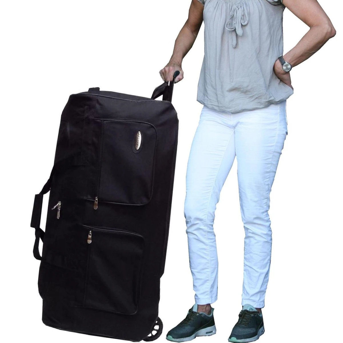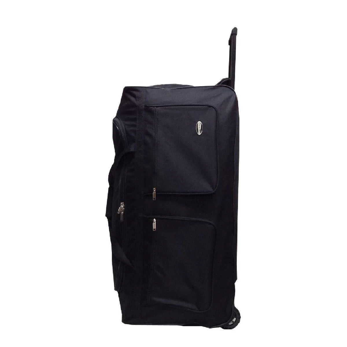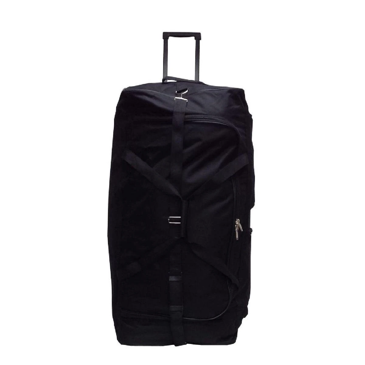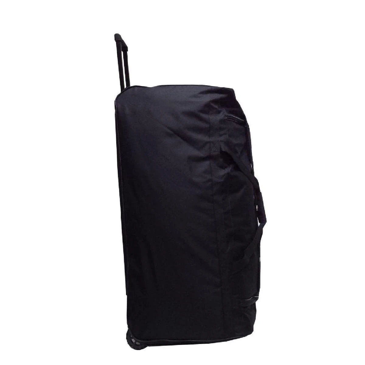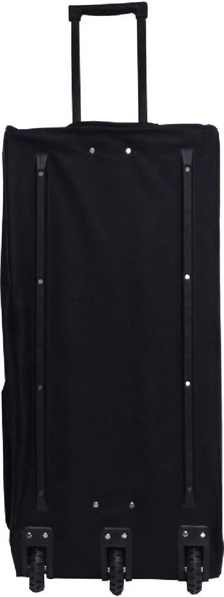 Supergrote wieltas met 3 wielen in kleur zwart. Op de voorzijde twee grote ritsvakken. Handvat en twee korte draagbanden.