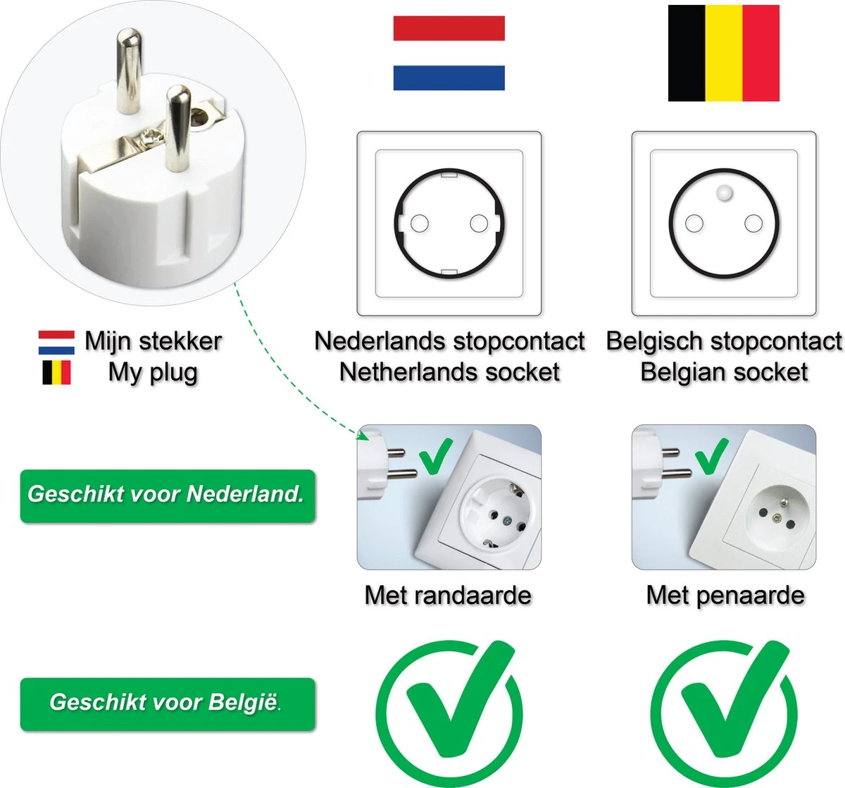 - Reisstekker type E & F worden vooral in Europe, Indonesië en Korea. Type E: België, Denemarken, Frankrijk, Polen, Tsjechië, Slowakije, enz. Type F: Duitsland, Nederland, Griekenland, Denemarken, Finland, Hongarije, IJsland, Italië, Zuid-Korea, Albanië, Andorra, Armenië, Oostenrijk, Azerbeidzjan, Wit-Rusland, Bosnië, Bulgarije, Kroatië, Estland, Faeröer, Georgië, Herzegovina en 41 andere landen.