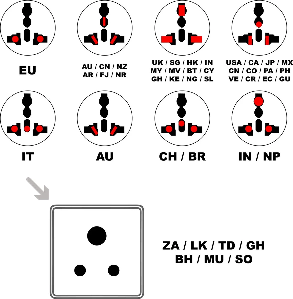 - Het stopcontactgedeelte van deze Reisstekker type M is universeel. Door het ontwerp van dit paneel is het compatibel met een groot aantal stekkers. Daarom is het eenvoudig om onze apparaten op deze stekker aan te sluiten om ze in het reisland te gebruiken.