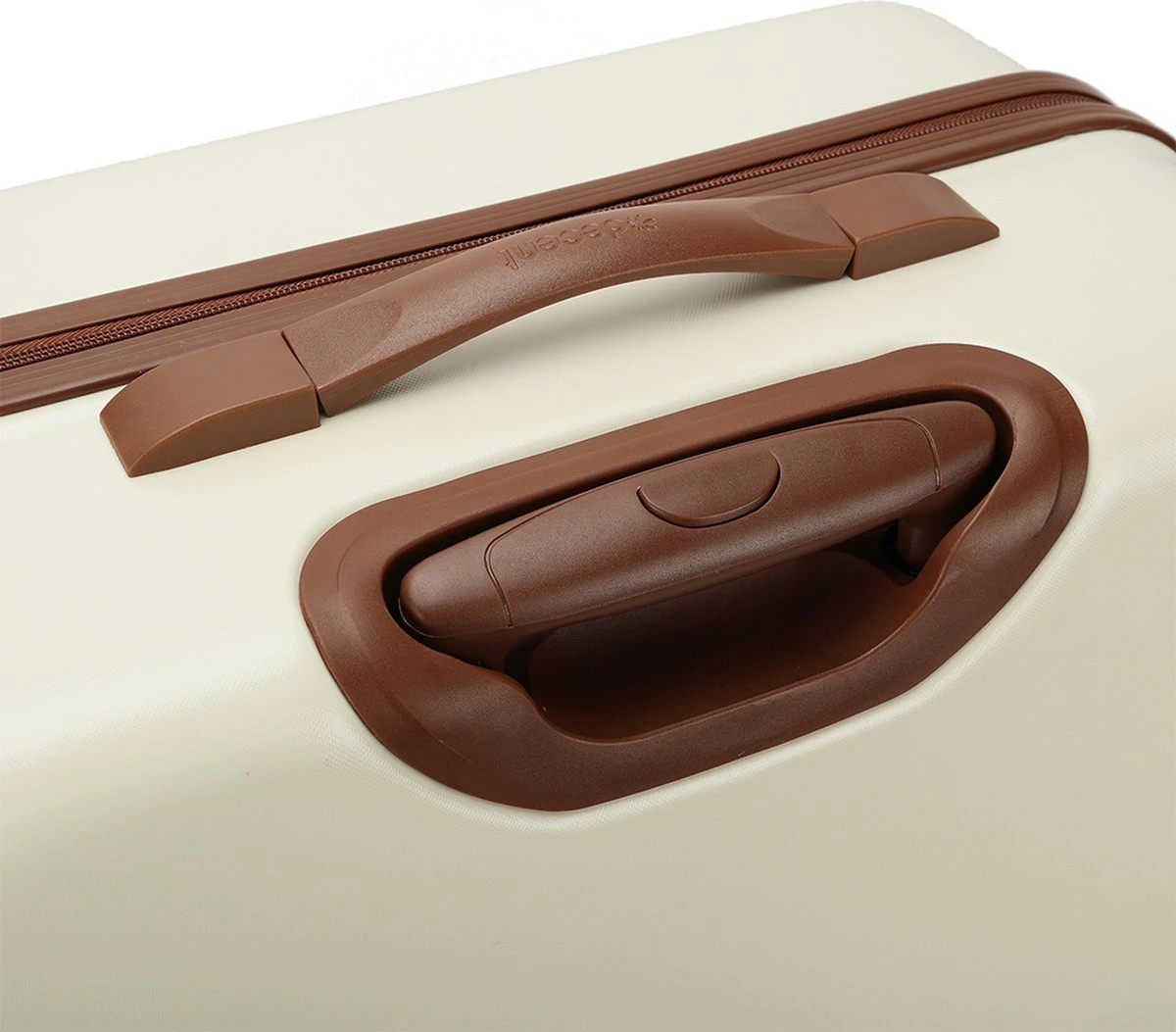 De Decent Retro serie is een betrouwbare koffer en je ideale reispartner. De schaal van de koffer is gemaakt van 100% polycarbonaat. Behalve dat je hiermee een prachtige licht glimmende afwerking krijgt, is de koffer ook nog eens super sterk en goed beschermd tegen schade. Polycarbonaat materiaal wordt in het algemeen gezien als een van de sterkste materialen om een koffer van te produceren. Dankzij de vier 360-graden draaiende dubbele wielen, twee prettig handvaten aan de bovenzijde en zijkant en een in hoogte verstelbare trekstang ben je van alle gemakken voorzien. Het luxe interieur bevat naast diverse rits vakken ook een tussenschot met rits en gekruiste inpakriemen. De koffer sluit je veilig met het TSA-combinatieslot, welke in de bruine kleur is verwerkt aan de zijkant van de koffer.