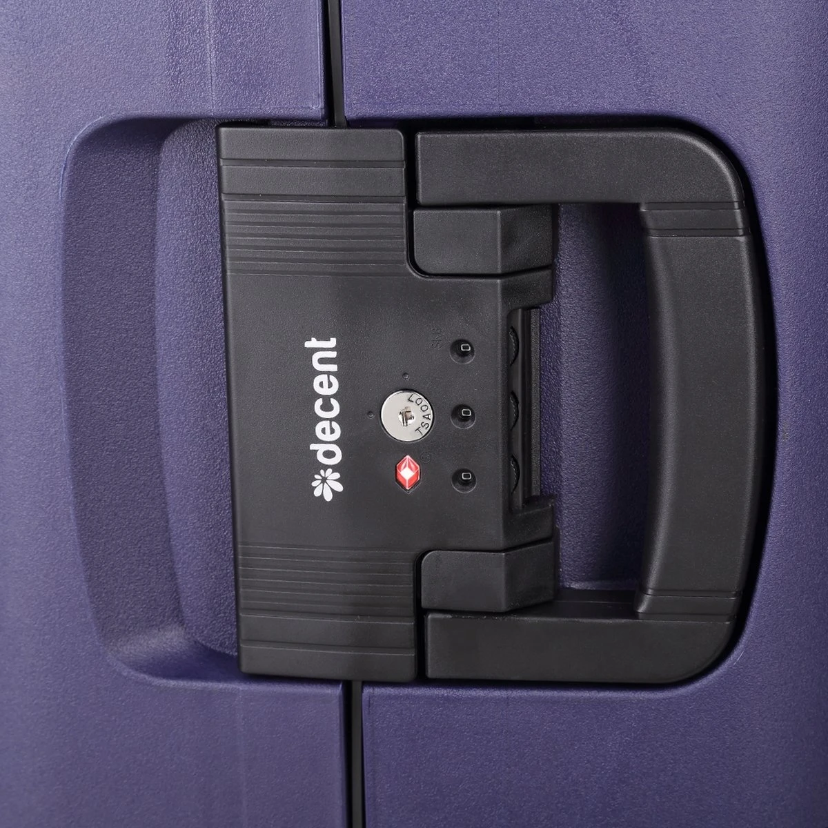 Grote polypropyleen hardschalen koffer uit de Transit serie van het merk Decent. De koffer is rondom voorzien van drie kliksloten. Op de boven-en onderkant zitten sloten die u vastklikt en op de zijkant zit het hoofdslot dat een TSA cijferslot is. De koffer heeft een zwarte voering, een tussenschot met rits, een extra ritsvak en is voorzien van spanbanden. Handvat op bovenkant en zijkant en voorzien van een comfortabel dubbel 4-wiel systeem.