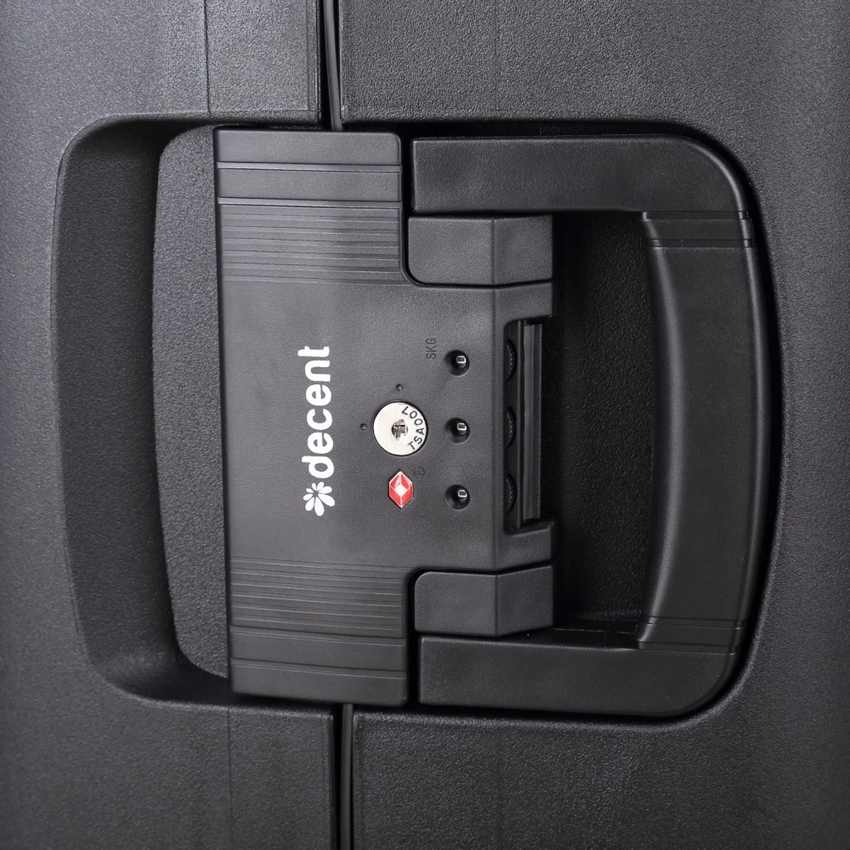 Grote polypropyleen hardschalen koffer uit de Transit serie van het merk Decent. De koffer is rondom voorzien van drie kliksloten. Op de boven-en onderkant zitten sloten die u vastklikt en op de zijkant zit het hoofdslot dat een TSA cijferslot is. De koffer heeft een zwarte voering, een tussenschot met rits, een extra ritsvak en is voorzien van spanbanden. Handvat op bovenkant en zijkant en voorzien van een comfortabel dubbel 4-wiel systeem.