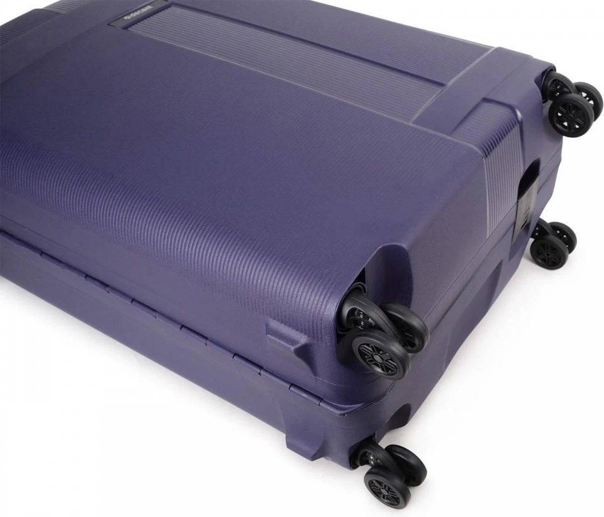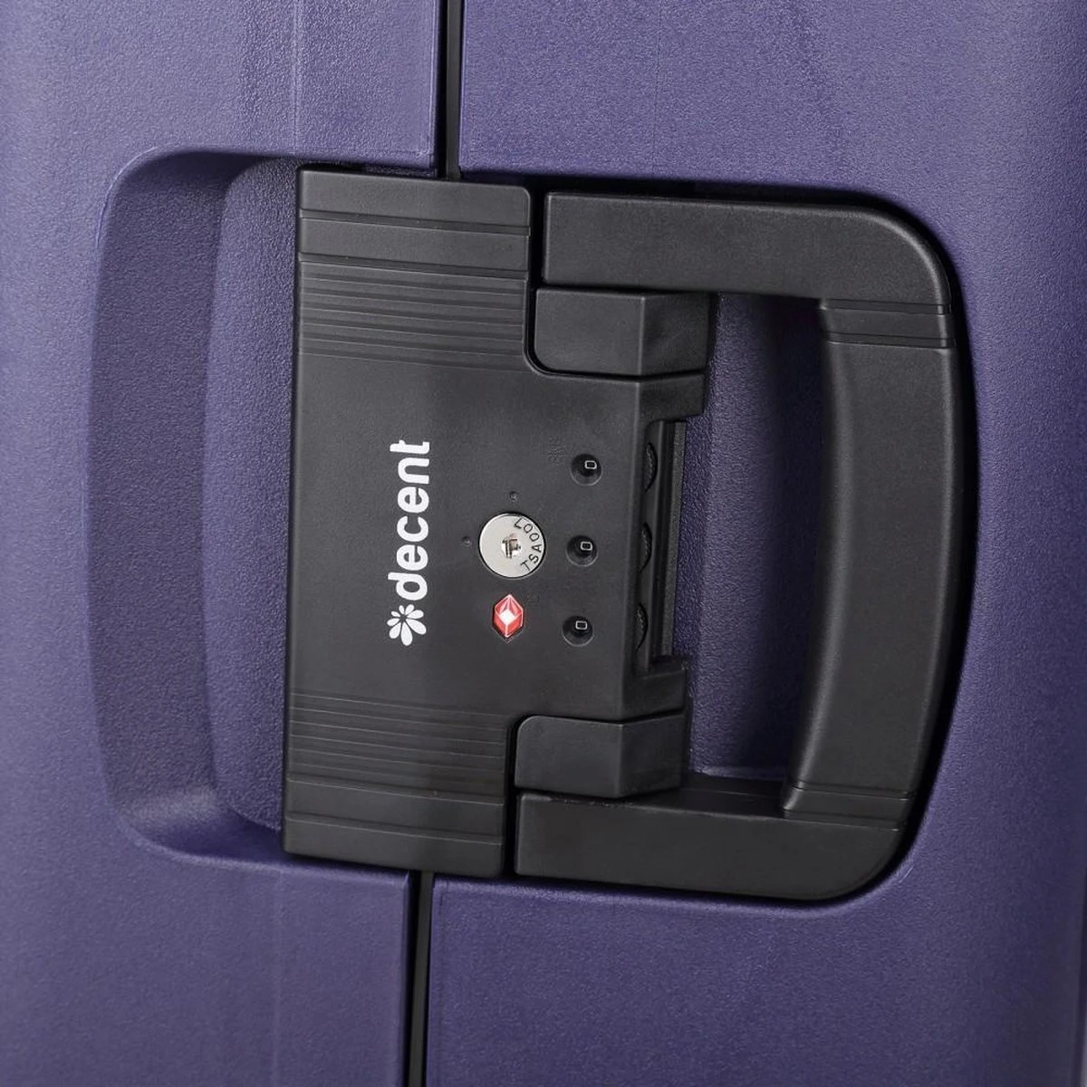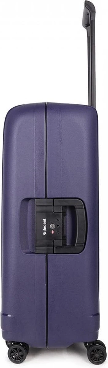 Middelgrote polypropyleen hardschalen koffer uit de Transit serie van het merk Decent. De koffer is rondom voorzien van drie kliksloten. Op de boven-en onderkant zitten sloten die u vastklikt en op de zijkant zit het hoofdslot dat een TSA cijferslot is. De koffer heeft een zwarte voering, een tussenschot met rits, een extra ritsvak en is voorzien van spanbanden. Handvat op bovenkant en zijkant en voorzien van een comfortabel dubbel 4-wiel systeem.