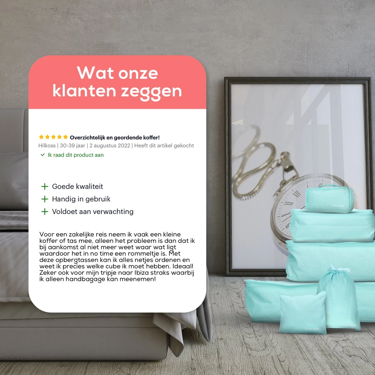 Onze beoordeling: 8/10. Deze packing cubes set van DreamTravel is behoorlijk uitgebreid. Met de zeven verschillende opbergtassen heb je voldoende ruimte om al jouw spullen netjes en overzichtelijk op te bergen in jouw koffer of backpack.