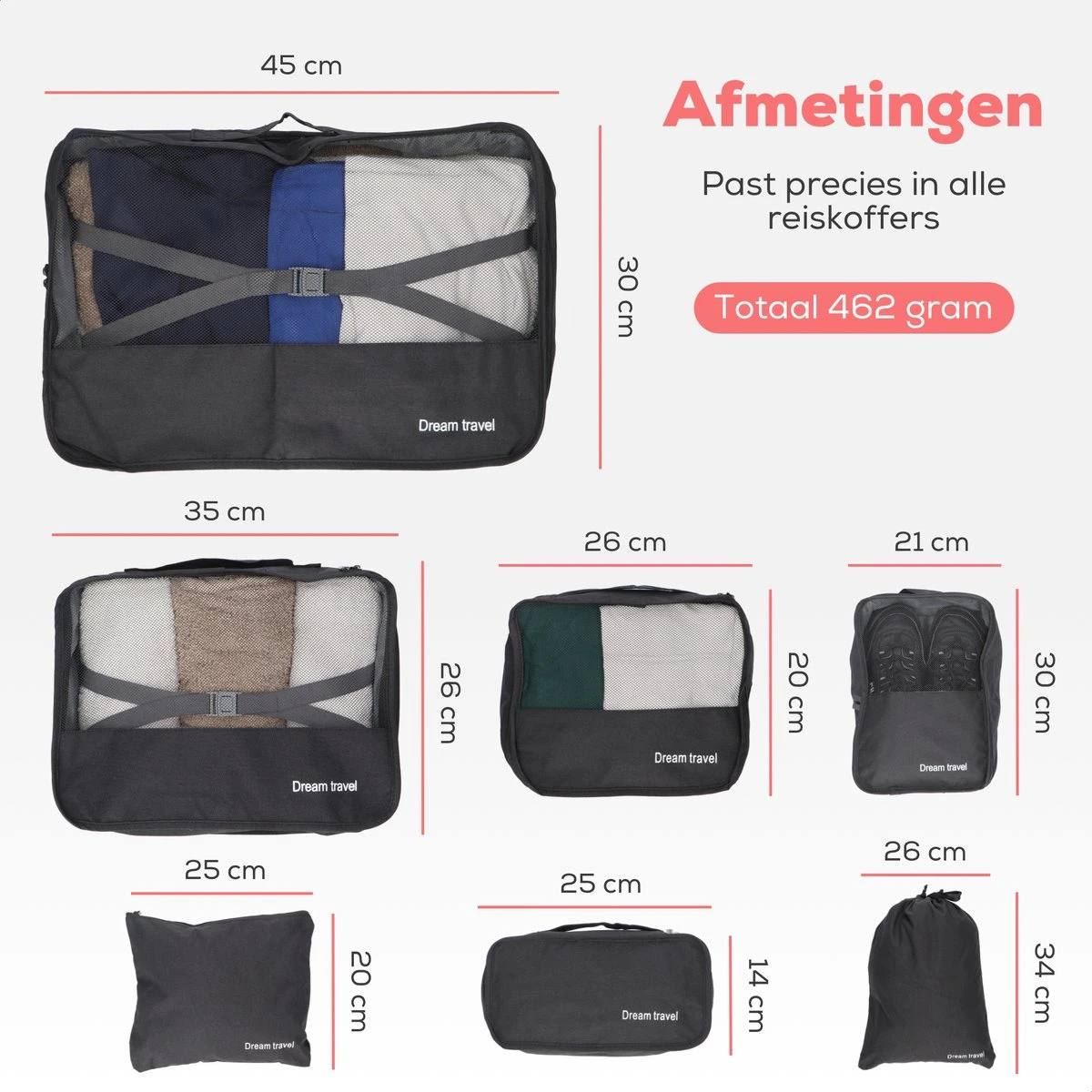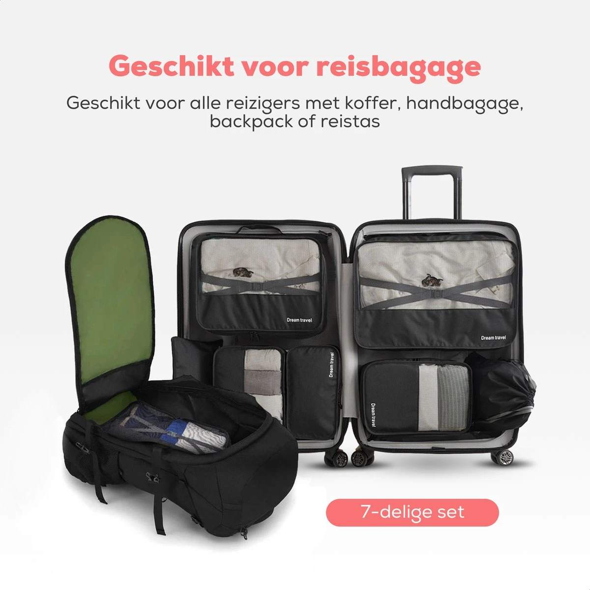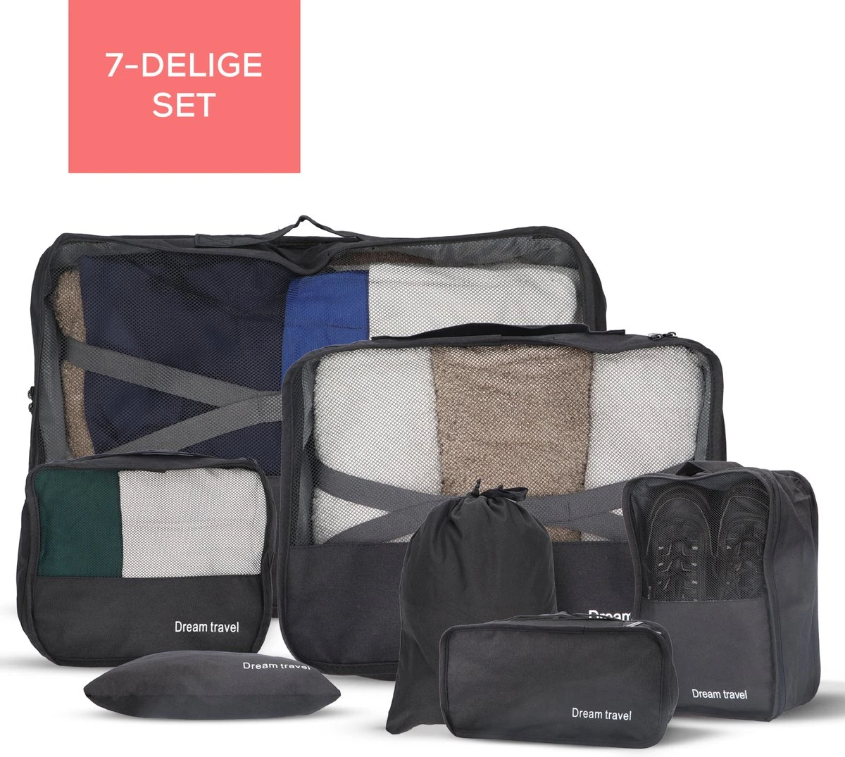Met deze handige zevendelige packing cubes organiser set van DreamTravel zorg jij ervoor dat jouw tasinhoud altijd netjes en geordend blijft.