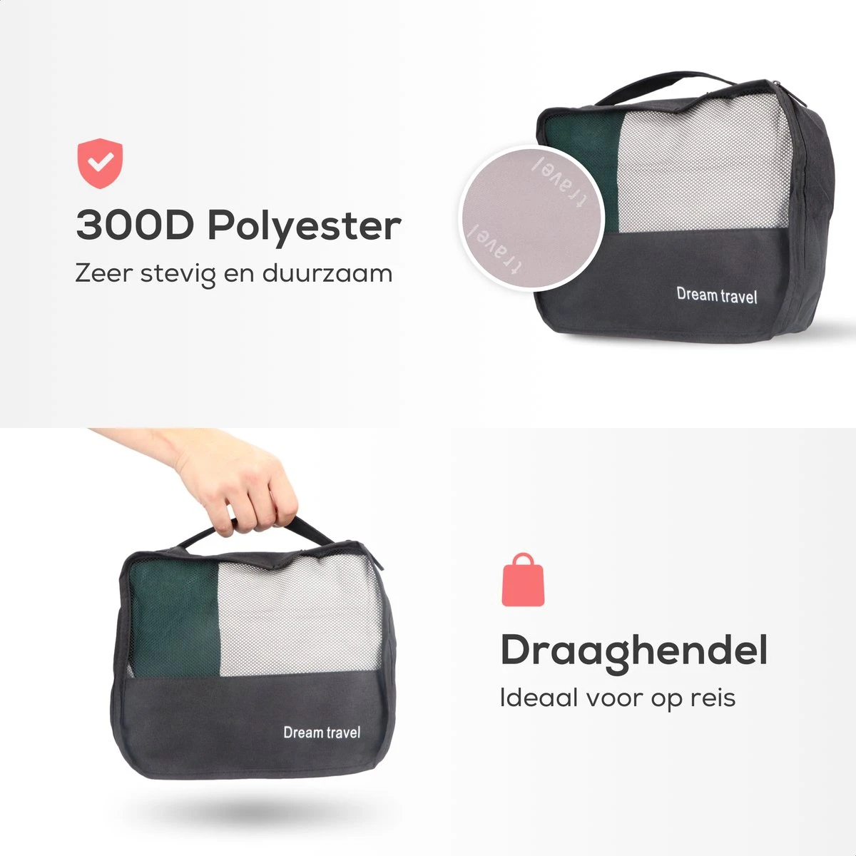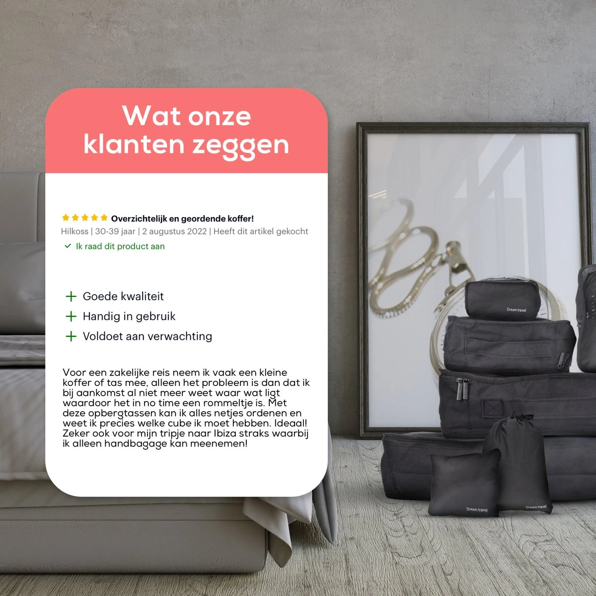 Onze beoordeling: 8/10. Deze packing cubes set van DreamTravel is behoorlijk uitgebreid. Met de zeven verschillende opbergtassen heb je voldoende ruimte om al jouw spullen netjes en overzichtelijk op te bergen in jouw koffer of backpack.