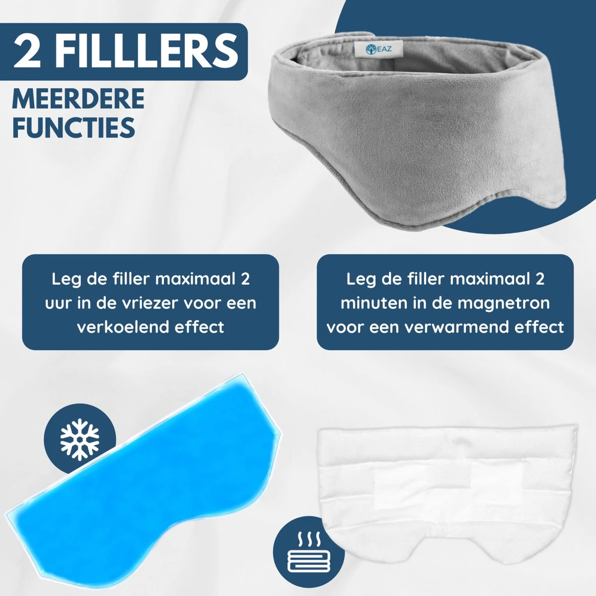 Het slaapmasker bevat twee fillers. Een filler welke je kunt verkoelen en de verzwaarde filler welke je kunt opwarmen. Door de koelfiller tot 2 uur in de vriezer te leggen, zorg je ervoor dat het masker een heerlijk verkoelend effect heeft. Dit helpt goed tegen koorts, hoofdpijn, migraine, of als je last van je ogen hebt.