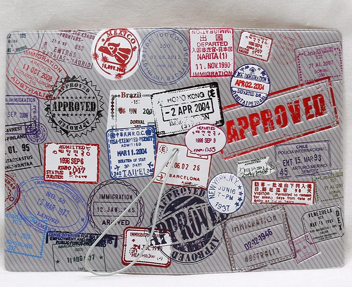 Leuk paspoort hoesje met de tekst ‘Approved’ erop en diverse stempels, Om uw paspoort te beschermen.