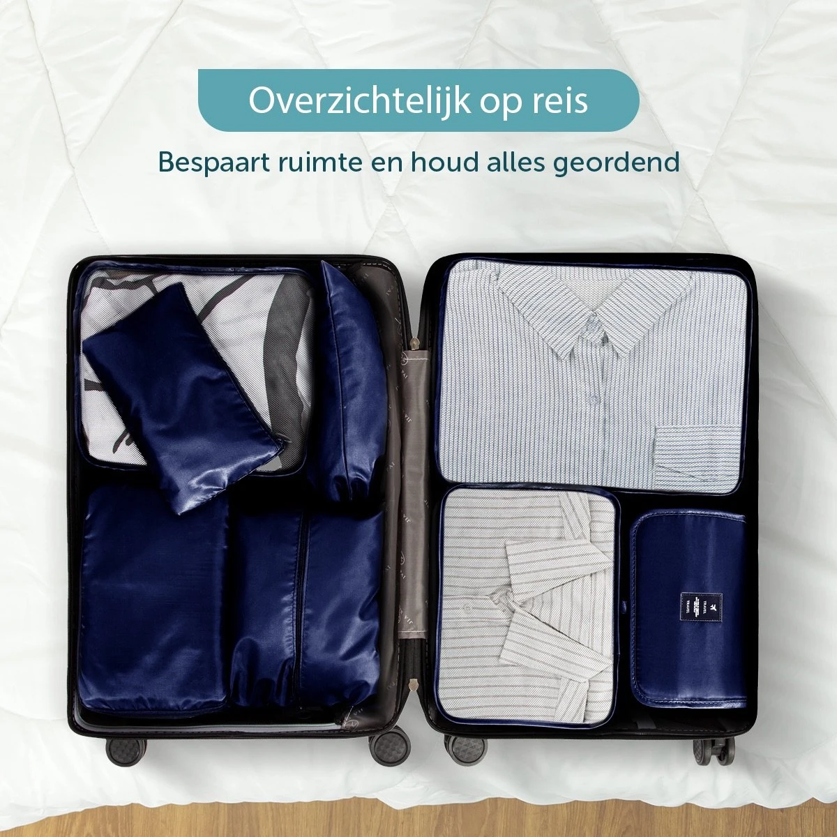 Door de diverse maten van de cubes heb je voor elk soort item de juiste opbergruimte. Je kan bijvoorbeeld werken van groot naar klein met de XL organizer voor jassen tot de maat S voor ondergoed. De dunnere kleding past gemakkelijk in de medium cube en de large is ideaal voor je truien en vesten. Uiteraard houd je je koffer en kleding schoon met de cube voor je schoenen en de speciaal bijgeleverde wastas voor de vuile was dat mee retour gaat. Een niet te missen toilettas vind je ook in deze 8-delige set. Tot slot kan je alle overige losse items zoals kabels in de kleine flatbag kwijt. De packing cubes zijn dé cheat voor koffer Tetris!
