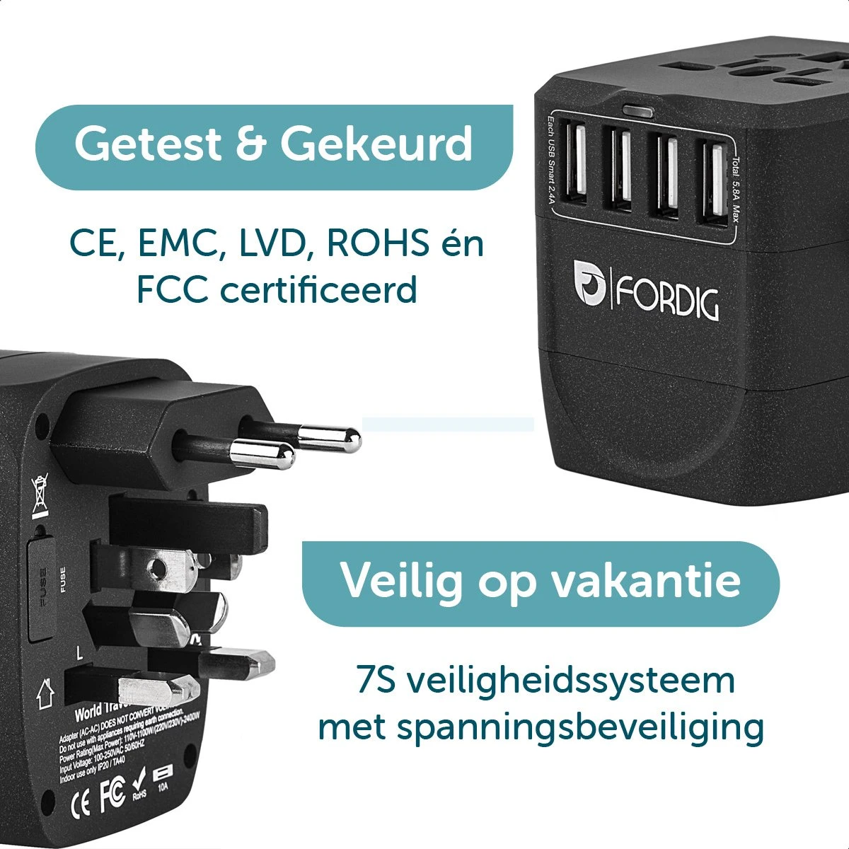 Je wilt natuurlijk niet de borg verliezen van je hotel of aan de huisbaas van je B&B uitleggen dat zijn appartement met de grond gelijk is gemaakt door een brandje vanwege jouw apparatuur. Daarom heeft de ForDig reisstekker een speciale smart chip met ingebouwde zekering, met het 7S beveiligingssysteem. Hierdoor heeft de adapter spanningsbeveiliging. Daarnaast is de stekker door een onafhankelijk bedrijf getest voor alle gevraagde eisen in diverse landen. Dit betekent dat de adapter het CE, EMC, LVD, ROHS én FCC certificaat heeft!