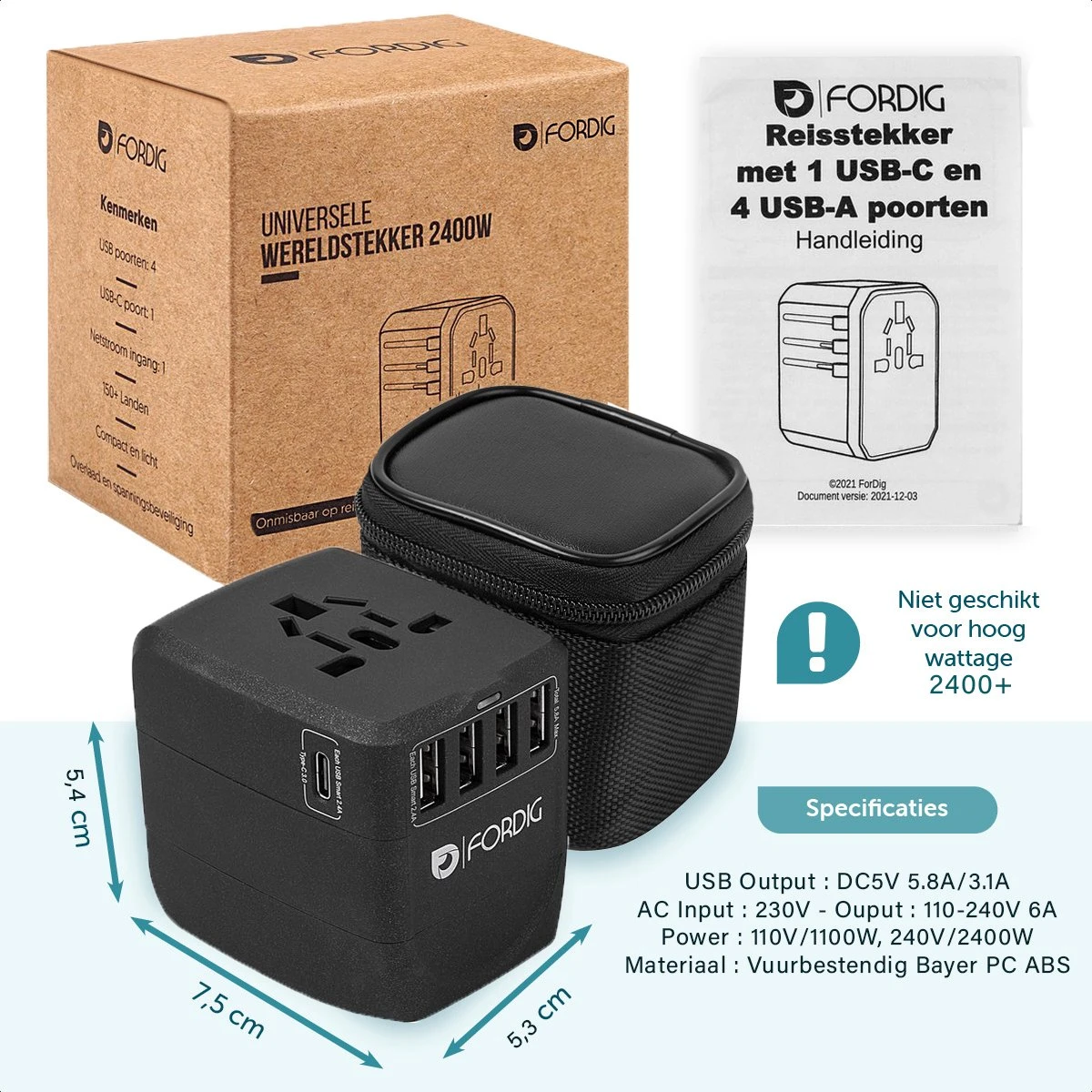We hebben allemaal wel 2 keer per jaar 6 maanden vakantie nodig en als je gaat vergeet dan nooit je ForDig Reisstekker! Met de 4 Fast Charge poorten, 1 USB-C poort en het netstroom contact laad je tot wel 6 apparaten in een mum van tijd tegelijkertijd op. Om te zorgen dat je niet in de problemen komt bij de douane heeft de reisstekker alle benodigde certificaten en is zo veilig mee te nemen op reis naar wel meer dan 150 landen! Deze compacte travel adapter weegt in totaal maar 184 gram, genoeg kilo’s voor alle andere ‘essentiële’ reisbenodigdheden dus! Inclusief opbergzakje. Uiteraard is de wereldstekker voorzien van het nieuwste 7S veiligheidssysteem met spanningsbeveiliging. ForDig bestaat alleen met en voor jou, bestel vandaag nog!