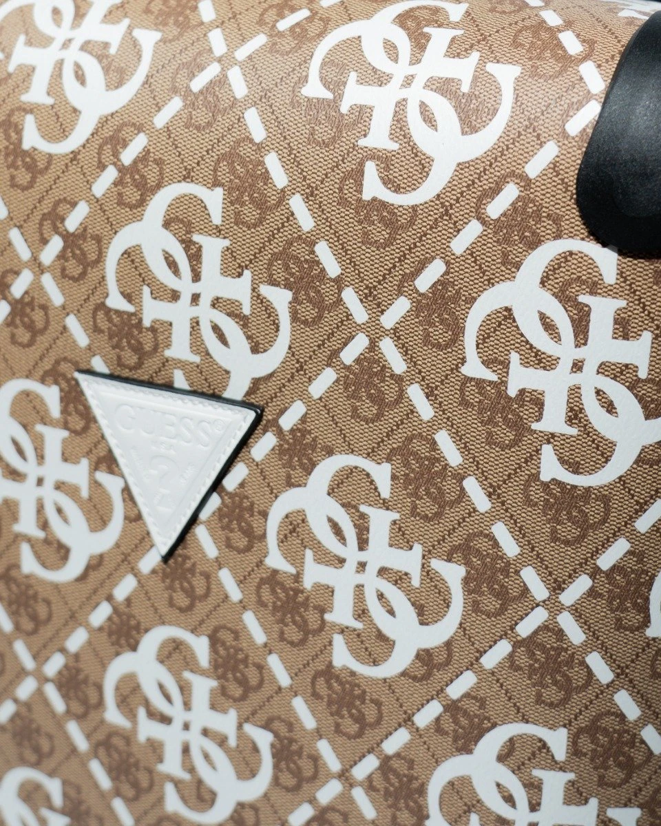 Wilder 18 Trolley Koffer De Wilder Trolley Koffer uit de nieuwste collectie van Guess. Deze koffer heeft een lichtbruine all-over logoprint met witte details. De koffer is voorzien van een ritssluiting, meerdere vakken aan de binnenzijde, een merklogo op de voorzijde en een nametag aan het handvat. Ook kan de koffer op slot en heeft deze 4 wielen. De koffer is gemaakt van 100% polyurethaan. Afmetingen (L x H x B) 31 x 55 x 22 cm.