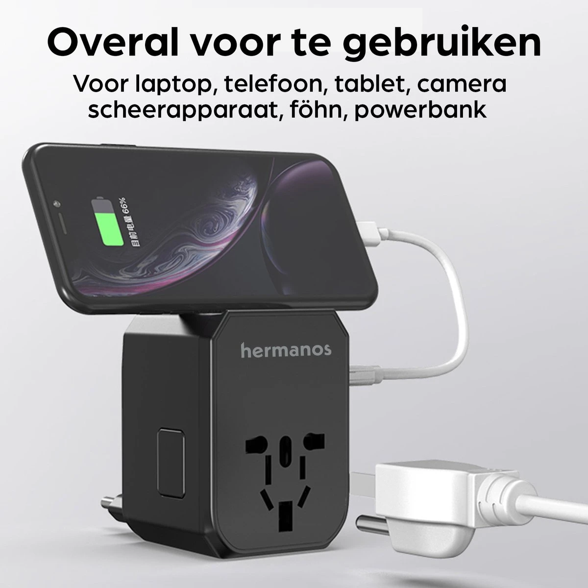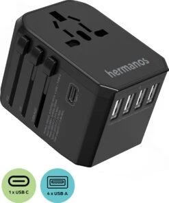 Ga goed voorbereid op vakantie met de universele wereldstekker van Hermanosยฎ. Dankzij de nieuwste technieken is deze in de meeste landen wereldwijd te gebruiken! In totaal zijn er vier supersnelle USB-A poorten, en een USB-C beschikbaar waarmee je vrijwel alle apparaten kunt opladen of gebruiken. Dit maakt dat je met de Hermanosยฎ reisstekker tot wel zes apparaten tegelijk kunt connecten. Met meerdere veiligheidsfuncties en extra hoog voltage is dit de wereldstekker die aan al je verwachtingen voldoet.
