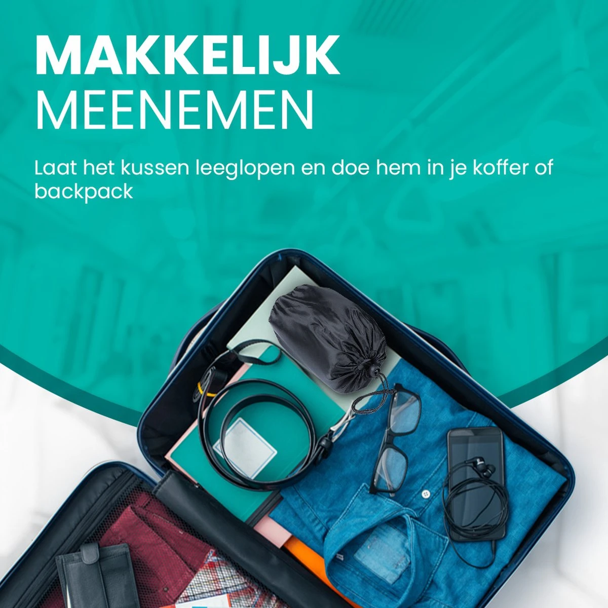 Kussens nemen vaak veel ruimte in beslag. Echter ons kussen is dusdanig op te vouwen, dat deze in ons kleine handige opbergzakje mee te nemen is. Het neemt dus amper ruimte in beslag in je backpack of koffer.