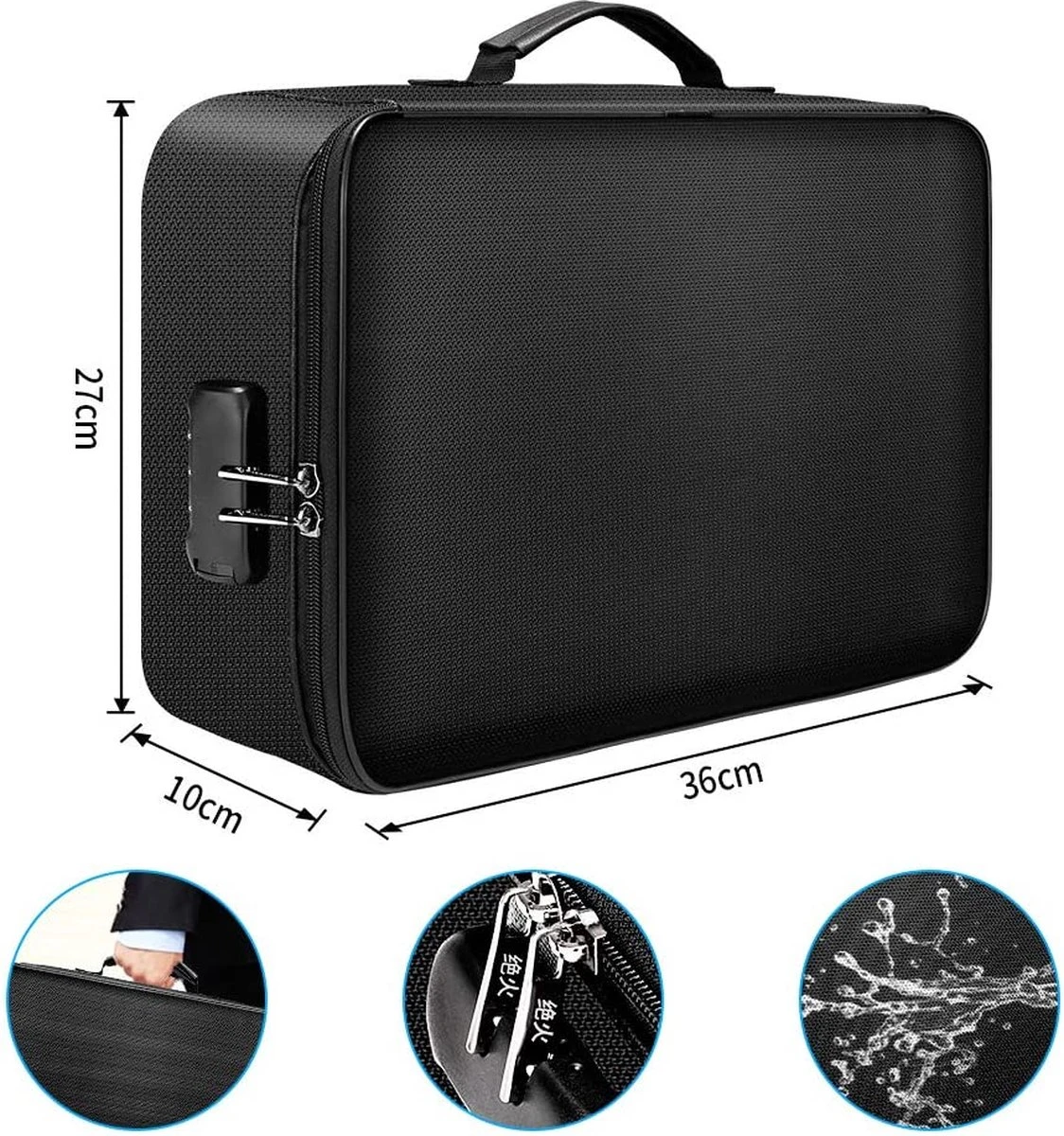 iBright opbergtas is gemaakt van hoogwaardige brandwerende glasvezeldoek, die brandwerend en duurzaam is. Tegelijkertijd zorgen de siliconen coating en ritssluiting voor uitstekende waterdichte prestaties, waardoor uw belangrijke documenten en waardevolle spullen effectief worden beschermd. Het gladde oppervlak kan stof, regen en krassen voorkomen.