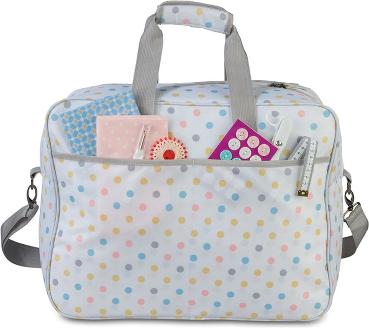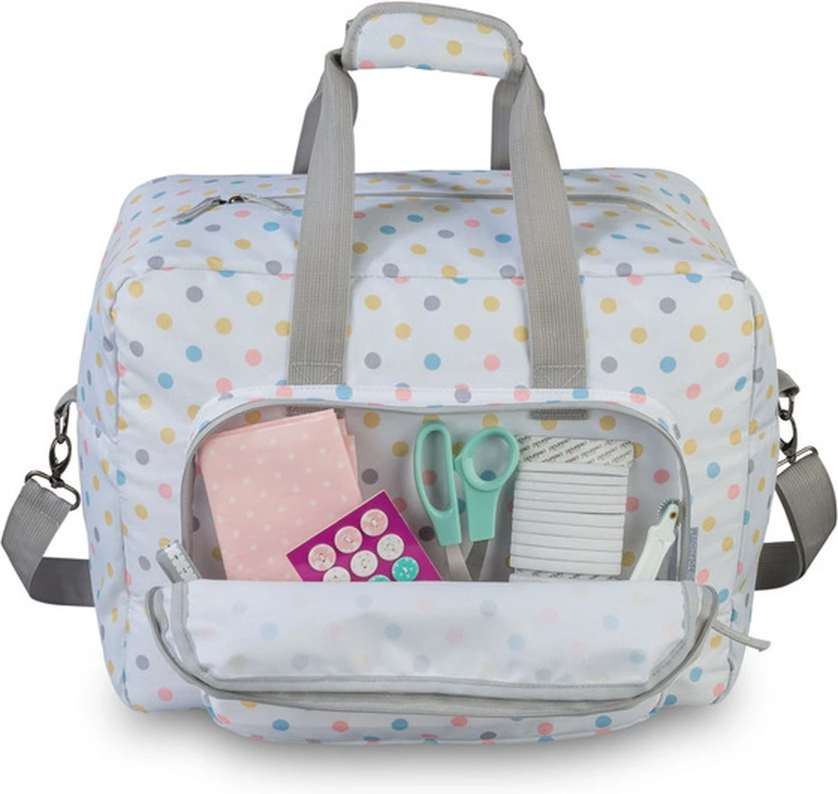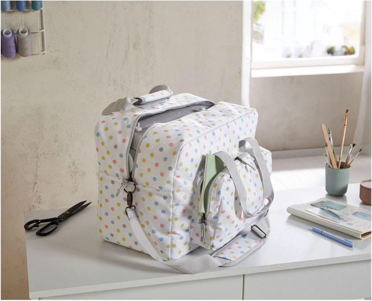 De tas heeft een groot hoofdvak waar de naaimachine veilig kan worden opgeborgen. Er zijn ook extra opbergvakken aan de buitenkant van de tas voor het opbergen van naai-accessoires zoals draden, spoelen en naalden. De voering aan de binnenzijde van de tas zorgt ervoor dat de naaimachine beter beschermt blijft De zakken zijn stevig bevestigd met ritsen , zodat uw spullen veilig opgeborgen blijven tijdens het transport.