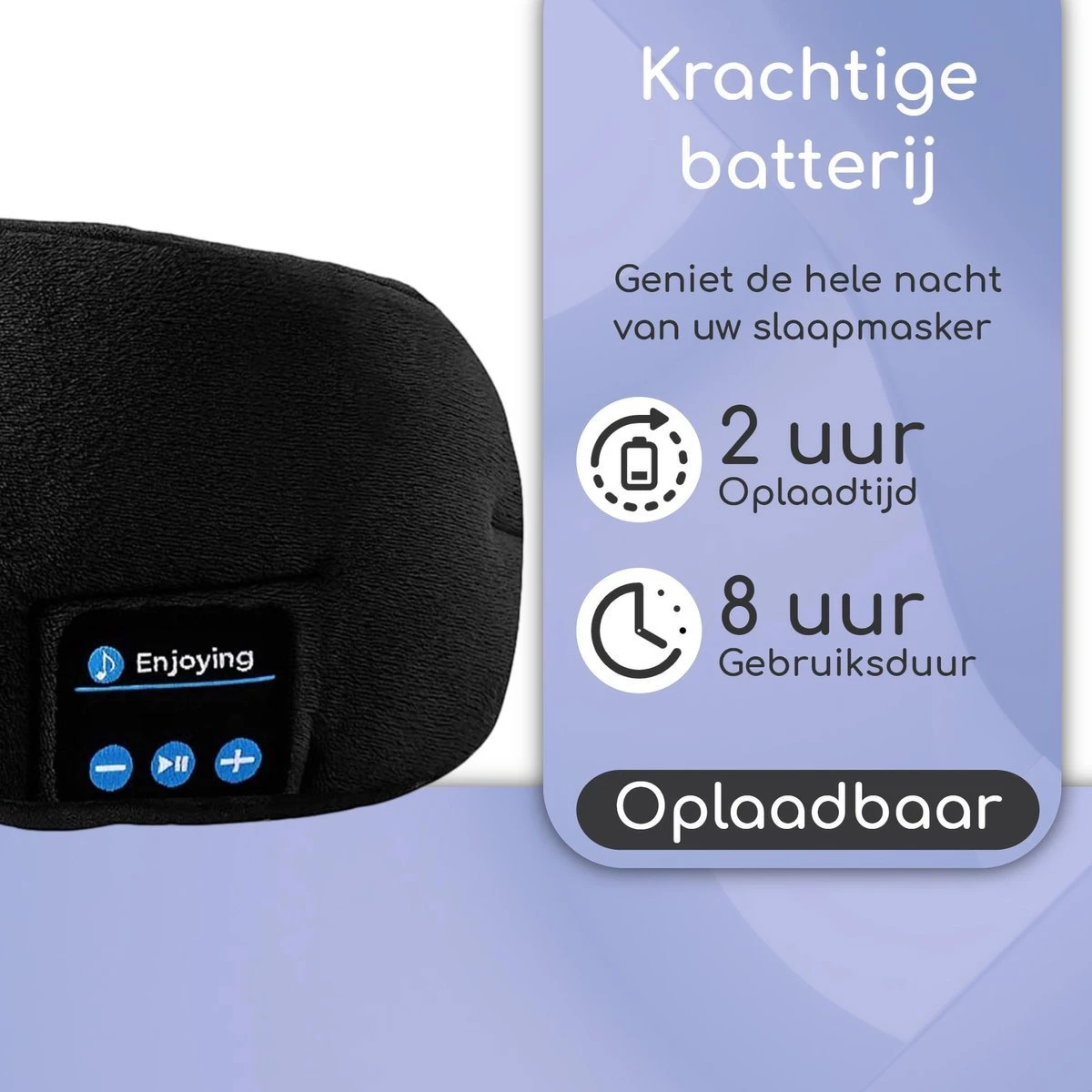 Het slaapmasker gebruikt dunne Hi-Fi speakers om een meeslepende audio-ervaring te creëren die perfect is voor muziek, meditatie, audioboeken en podcasts. Ook wordt ruis geëlimineerd. De batterij is opgeladen in 2 uur en speelt tot 8 a 9 uur muziek af!