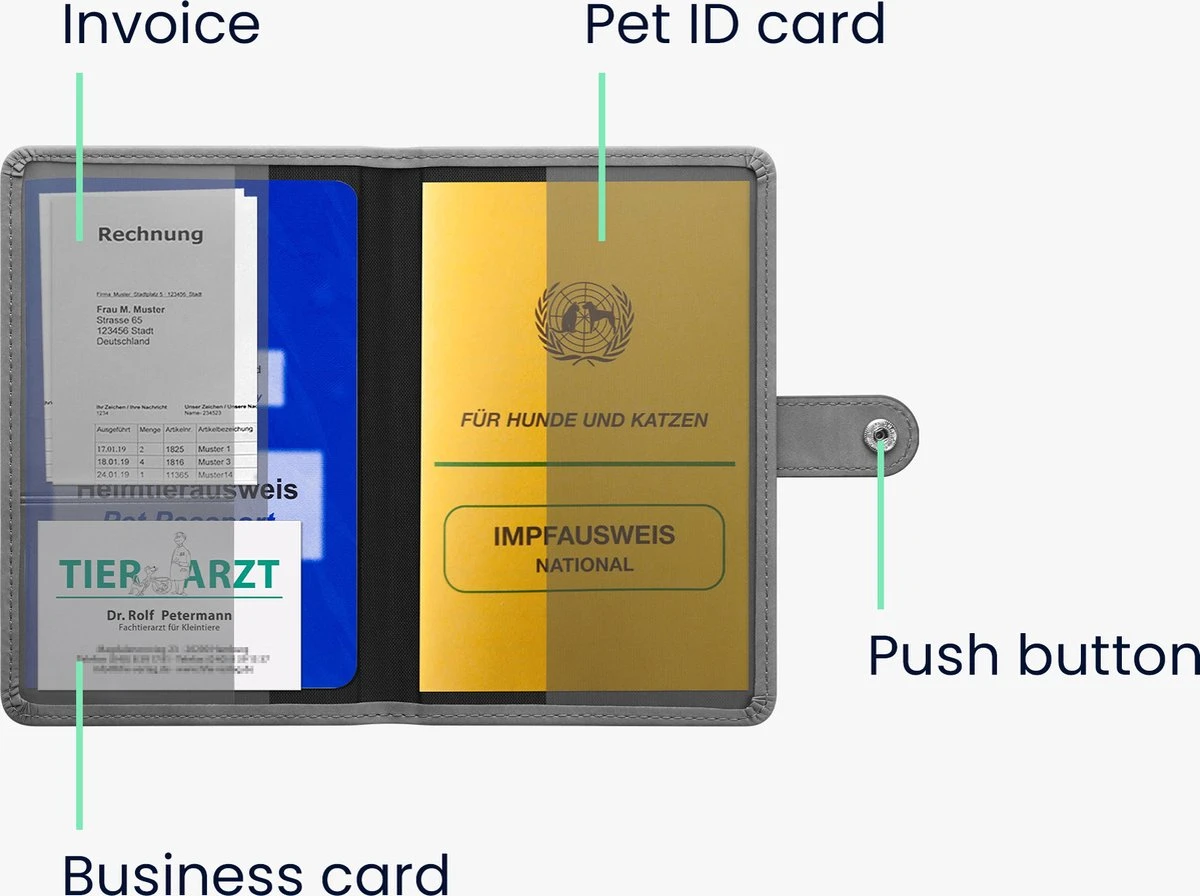 - SLUITBAAR: Het hoesje beschikt over een drukknoop, waardoor hij makkelijk te openen en te sluiten is. Daarnaast beschermt het het dierenpaspoort nét wat beter tegen kreuken en vocht.