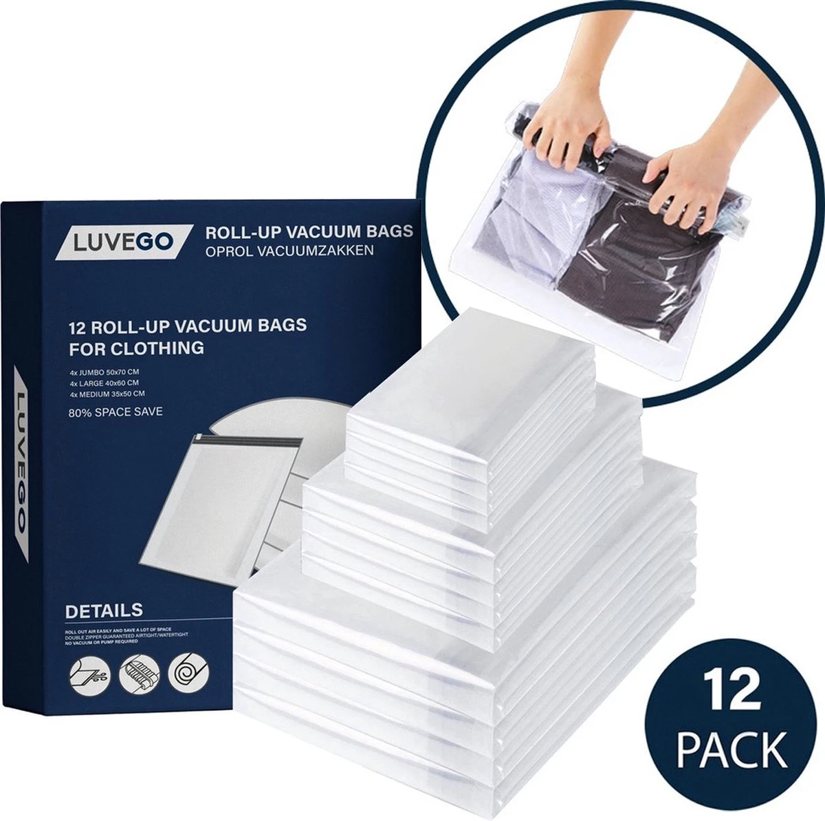 Vacuüm opbergzakken voor op reis? Passen je kleren niet allemaal in die ene tas of koffer welke je mee wilt nemen op reis? Bespaar tot 80% aan ruimte in je koffer of tas met deze handrol zakken van Luvego. Met deze 12 handrol zakken heb je geen stofzuiger of iets van een apparaat nodig, gewoon kleding erin, lucht eruit rollen en het is vacuüm. Ideaal wanneer je op reis bent en geen stofzuiger of luchtpomp bij de hand hebt!