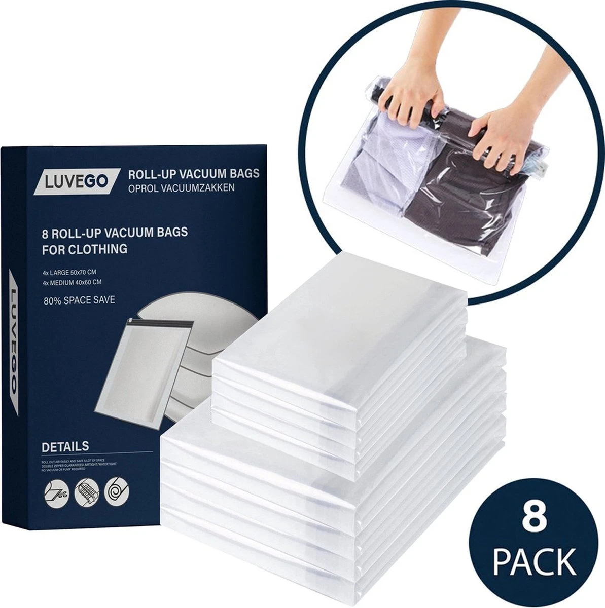 Vacuüm opbergzakken voor op reis? Passen je kleren niet allemaal in die ene tas of koffer welke je mee wilt nemen op reis? Bespaar tot 80% aan ruimte in je koffer of tas met deze handrol zakken van Luvego. Met deze 8 handrol zakken heb je geen stofzuiger of iets van een apparaat nodig, gewoon kleding erin, lucht eruit rollen en het is vacuüm. Ideaal wanneer je op reis bent en geen stofzuiger of luchtpomp bij de hand hebt!