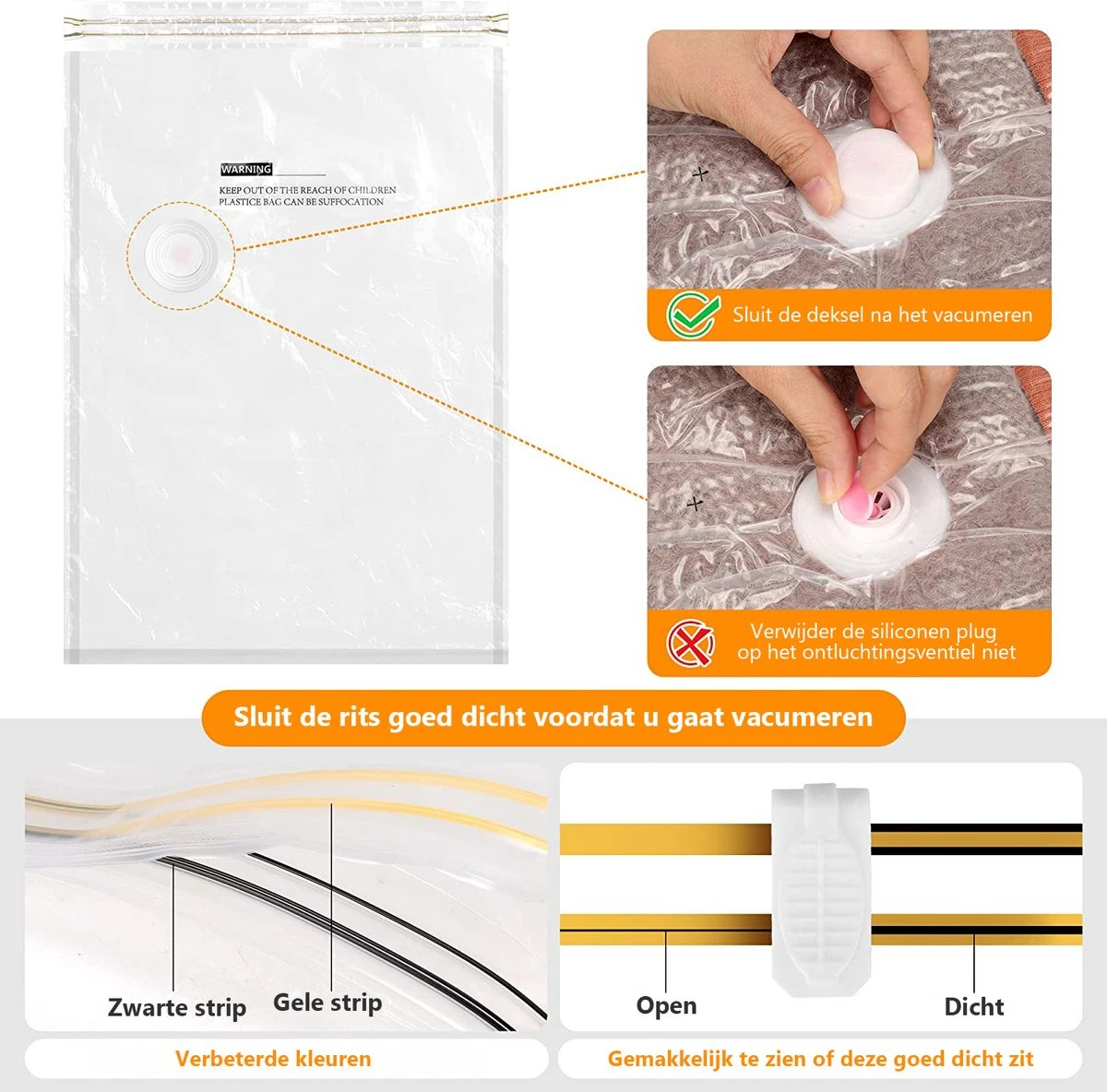 GEBRUIK: Het gebruik is zeer eenvoudig met behulp van een standaard stofzuiger. Sluit de stofzuiger eenvoudig aan op het ventiel. Zuig nu de lucht volledig uit met de stofzuiger en sluit deze vervolgens af met de dop.