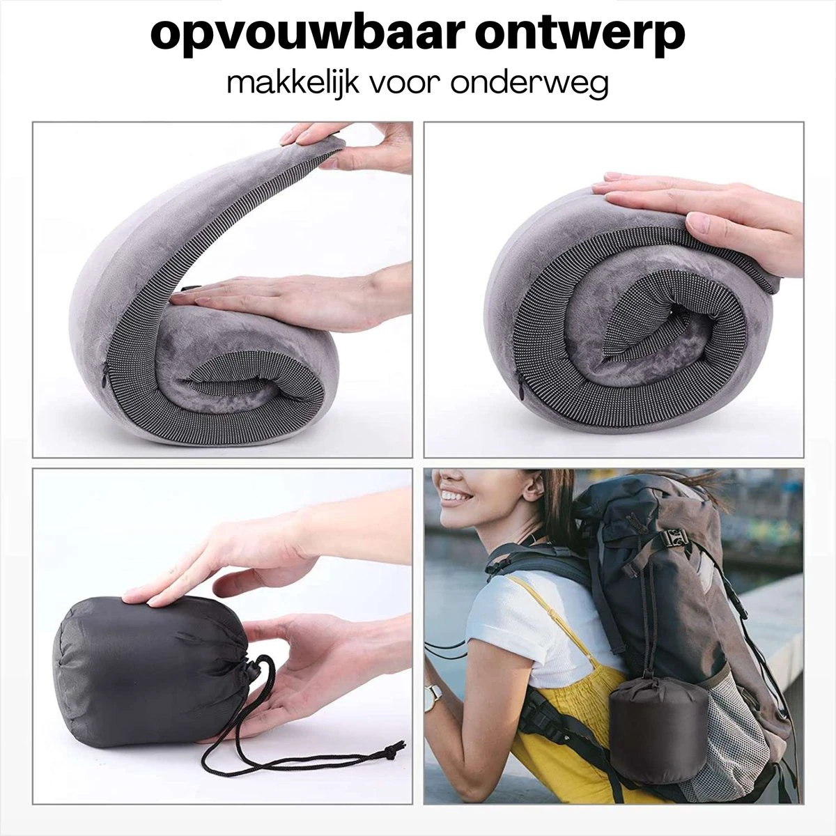 Het kussen wordt meegeleverd met een opbergtasje. De kussen heeft een opvouwbaar ontwerp daardoor kunt u deze makkelijk opbergen in het tasje.