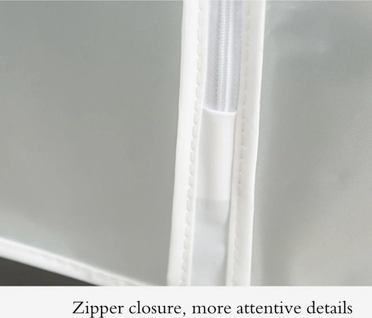 - Fijne afwerking: het is gemaakt van hoogwaardige PEVA-, PE- en EVA-materialen. Het is milieuvriendelijk en duurzaam, heeft een goede luchtdoorlatendheid en is gemakkelijk schoon te maken. Het keurt gladde en gladde metalen rits aan. Het heeft een goede textuur en kan vele malen zonder schade worden gesloten.