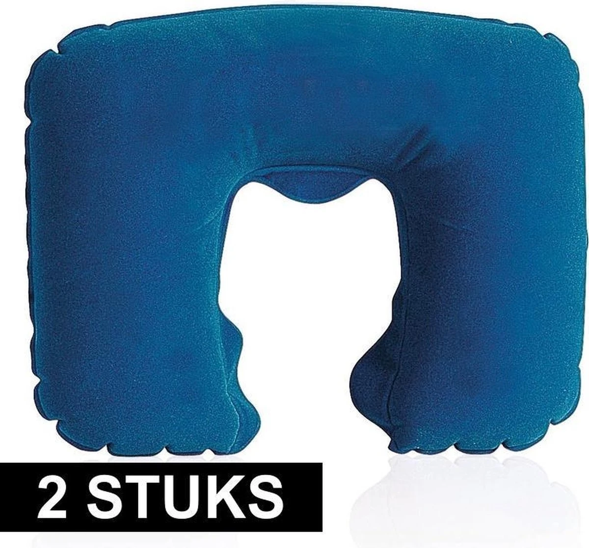 2x Opblaasbare nekkussen donkerblauw voor bijvoorbeeld in de auto, trein of vliegtuig. Materiaal: microfiber. Formaat nekkussentjes: 43 x 26,5 cm. U ontvangt 2 stuks. Opblaasbare nekkussens/reiskussens.