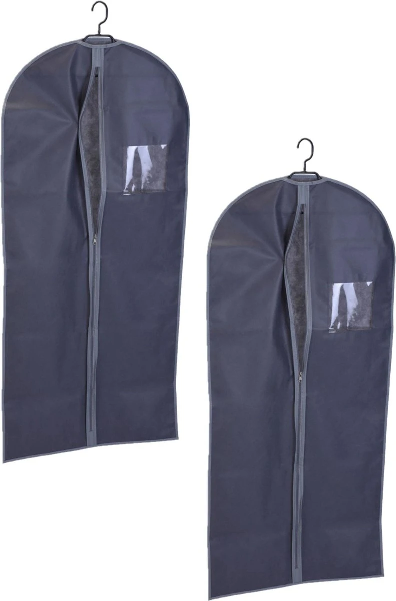 2x stuks donkergrijze kledinghoezen 60 x 135 cm met venster. Een donkergrijze beschermhoes om uw kleding stofvrij op de bergen of op een nette manier te vervoeren. De hoes heeft een volledige ritssluiting en een kunststof kijkvenster aan de voorzijde. Afmeting: ca. 60 x 135 cm. Materiaal: polyester/kunststof. Exclusief kledinghanger.