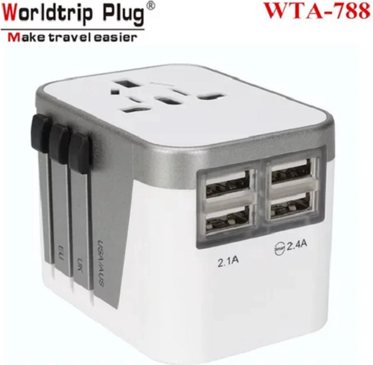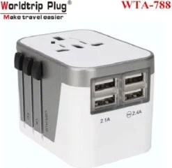 Universele reisadapter is geschikt voor het opladen van allerlei soorten apparaten. bijvoorbeeld voor tetefoons,laptops,camera’s, e-readers en nog veel meer. De reisadapter bevalt 4x USB poorten. voordelen: * Universeel en werkt in meer dan 150 laden * Tot 4 apparaten tegelijk opladen * Heeft totaal 4 USB poorten * Met veiligheidszekering Reisadapter specificaties * Input 100-240vAC-50/60Hz400mA * Totaal laad vermogen 8A * Gebruikt 8A veiligheidszekering * Maxpower : 800W op 110v,1840W op 230v * Behuizing materiaal : ABS +pc * Product foormaat 53mm L*50mm B *69mm H * Netto gewicht : 135g