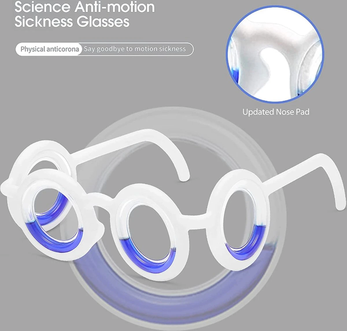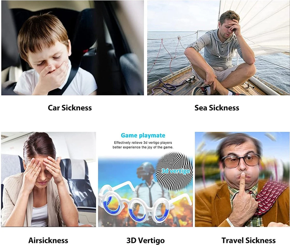 - Productvoordelen: reisziektebrillen kunnen met de auto of boot, paardrijden, boottochten, rotatiespellen op grote hoogte, vliegen, games, draagbare videogames worden gebruikt. Effectieve preventie van zeeziekte, autoziekte, vliegtuigziekte en andere reisziekten. Met neuskussentje, dat ervoor zorgt dat de bril niet gemakkelijk valt en comfortabel is voor alle hoofdmaten en vormen.