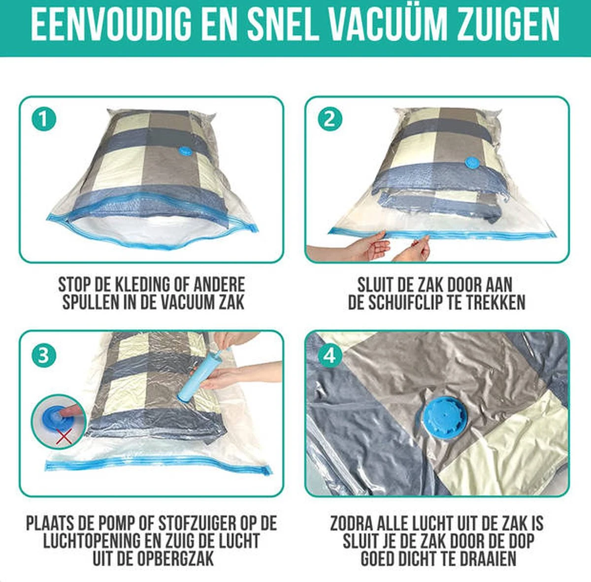 De vacuum zakken van Naturn Living zijn verkrijgbaar in verschillende maten, waaronder extra grote maten die geschikt zijn voor grotere items zoals beddengoed of winterkleding. Ze worden geleverd met eenvoudig te gebruiken vacuรผmzakken die u gemakkelijk kunt open- en sluiten met behulp van de handige sluiting aan de bovenkant.