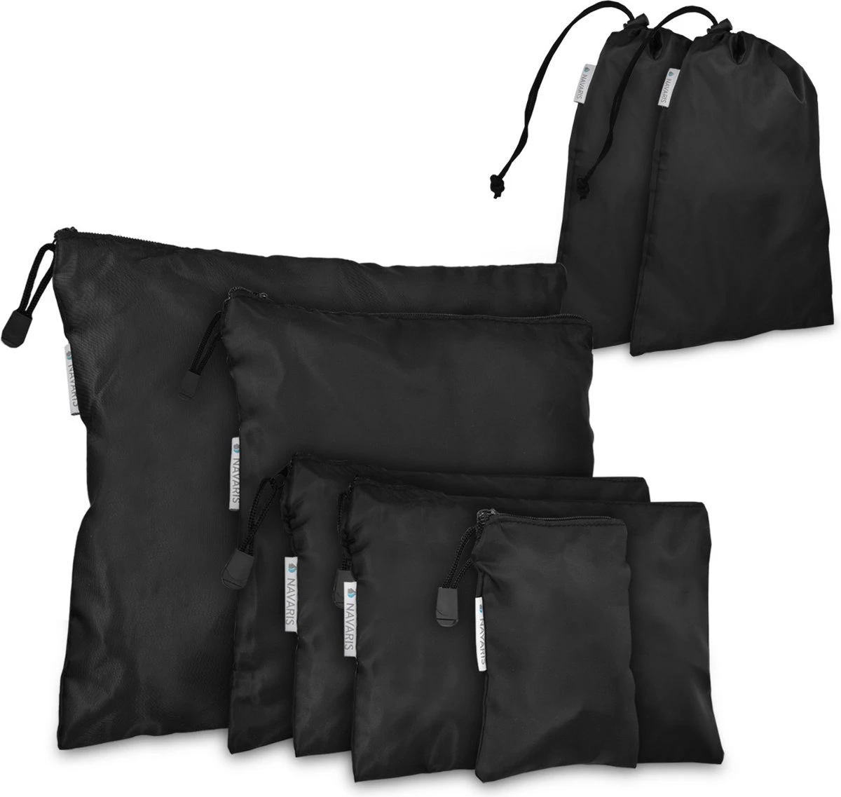- NETJES INGEPAKT: Neem je bagage netjes mee in deze 7-delige set pocket cubes van zwart nylon. De zakjes van verschillend formaat hebben een ritssluiting of trekkoord. Handig om kleding, toiletspullen, make-up, schoenen en meer in op te bergen.
