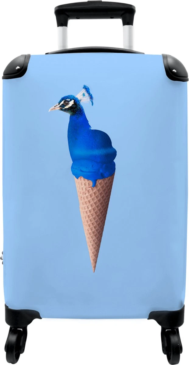 Zoek je nog een unieke koffer om mee te nemen op vakantie? Dan is deze fotokoffer echt iets voor jou! Op de koffer staat een ijshoorntje met een pauw en een blauw ijsbolletje.