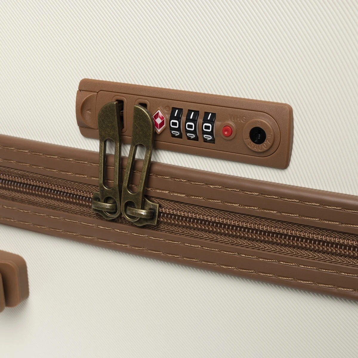 Grote spinner uit de Florence serie van Oistr. Deze prachtige koffer is met haar design en frisse kleurstelling gericht op de moderne reiziger. De koffer is gemaakt van ABS en licht van gewicht. De vorm van de schaal is klassiek met een modern touch in de vorm van een gekruiste baan over de schaal. De koffer heeft een ruime inrichting met aan de ene kant een compartiment met inpakriemen en aan de andere zijde een tussenschot met netvak. De unieke kleurstelling met mat pink of olive green en licht bruin geeft de koffer een prachtige look and feel die doet denken aan de jaren 70. De trekstang is van glimmende gold aluminium en in hoogte verstelbaar. Zowel aan de bovenzijde als aan de zijkant bevindt zich een handvat voor maximaal draaggemak. Dankzij de vier roterende wielen is je koffer makkelijk te vervoeren. Met TSA cijferslot voor zorgeloos reizen van en naar de VS, deze is verzonken (vlak weggewerkt) in de zijkant van de koffer. De koffer is in alle gemakken voorzien en een stijlvolle verschijning tijdens jouw reis.