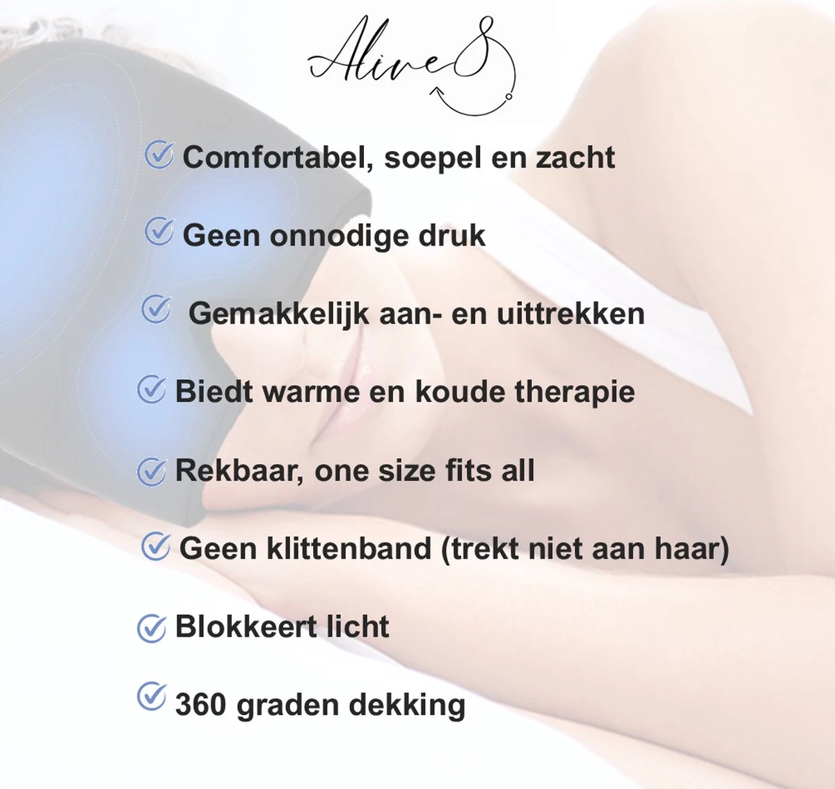 Onze Alive8 Slaapmasker is van Hoogwaardige kwaliteit: In het slaapmasker zit gel van expertkwaliteit die voor warme- of koude ontspanning gebruikt kan worden. Je kunt het slaapmasker ook zonder koeling of verwarming dragen, het heeft een verkoelend effect waardoor je een ontspannend gevoel krijgt en sneller in slaap valt.