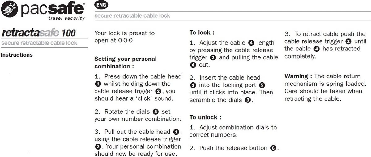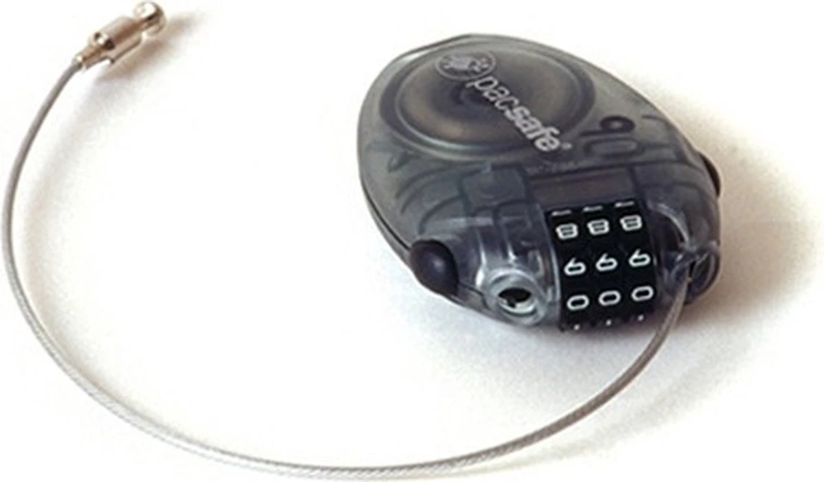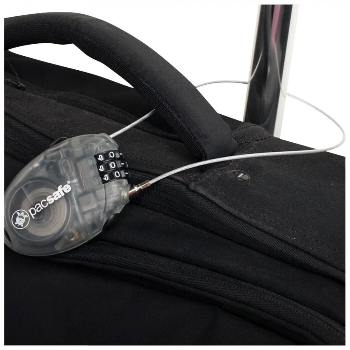 De Pacsafe RetractaSafe 100 is een anti-diefstal, uittrekbaar 3-cijferig kabelslot. Dit kleine kabelslotje is ideaal om meerdere tassen, foto-uitrusting, ski’s, helmen, fietsen en andere waardevolle bezittingen op slot te zetten aan een vast punt zoals een stoel. De lengte van de roestvrij stalen kabel is 73 cm.