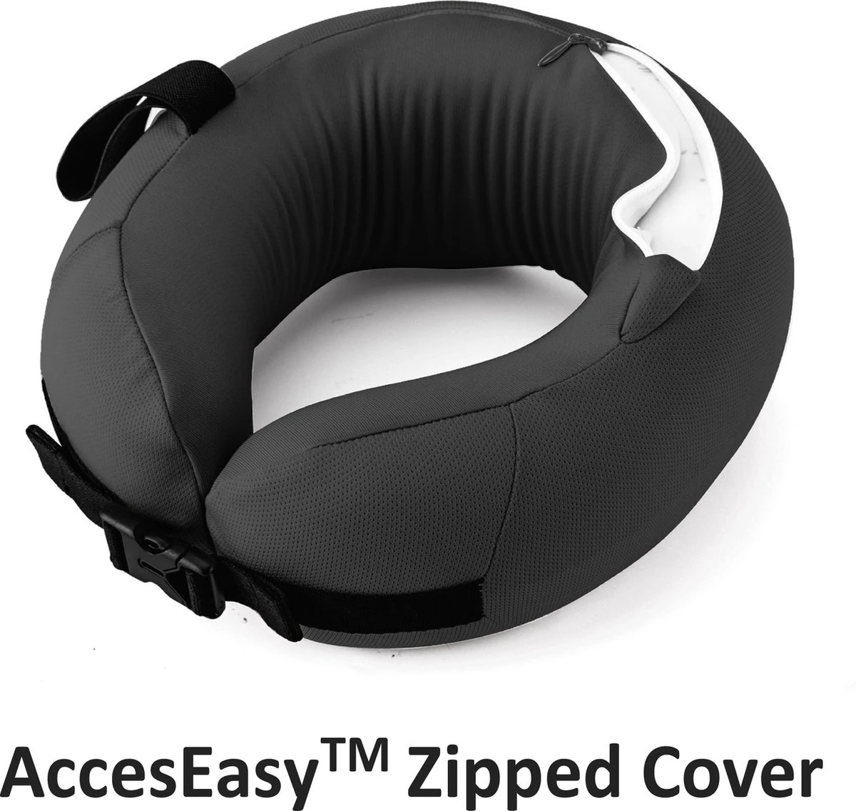 Unieke opvouwbare nekkussen met vol ergonomische ondersteuning voor kin en nek. COOLPASS vocht afvoerende stof tegen zweten. Dit is erg handig omdat het nogal eens warm kan worden in het vliegtuig of bus bijvoorbeeld. Makkelijk om mee te nemen in de handige verpakking. Op deze manier neemt het weinig plek in de (hand) bagage. Door de handige karabijn haak gemakkelijk te bevestigen aan de tas. De hoes van het kussen is afneembaar en kan gewassen worden.
