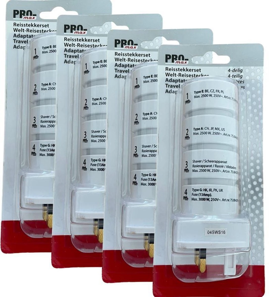 Promax Pro-Max Reisstekker – Wereldstekker Universeel – 4-delig – 4-pack