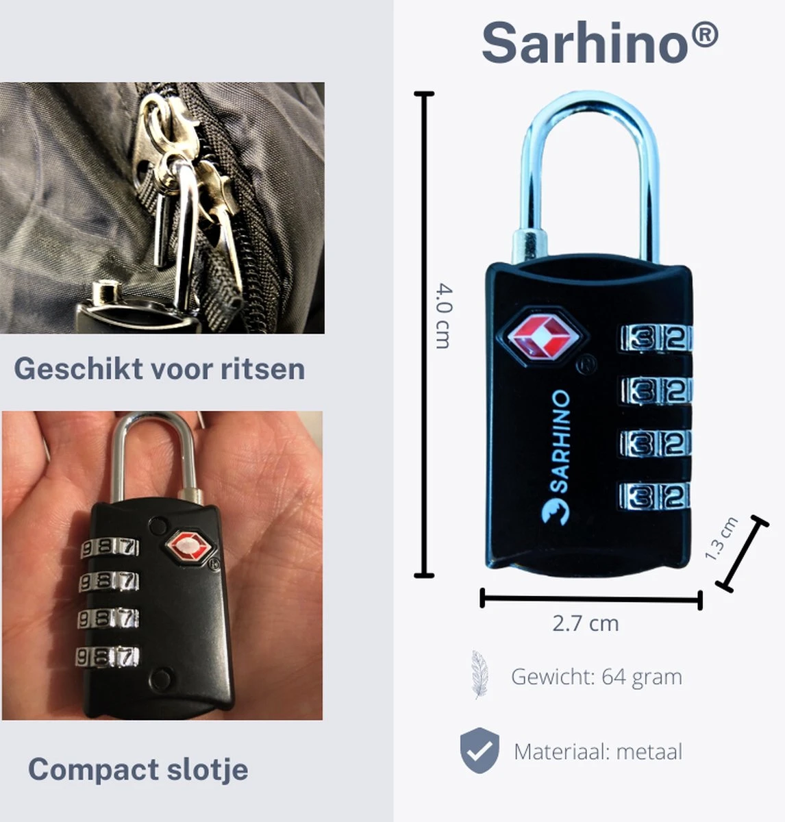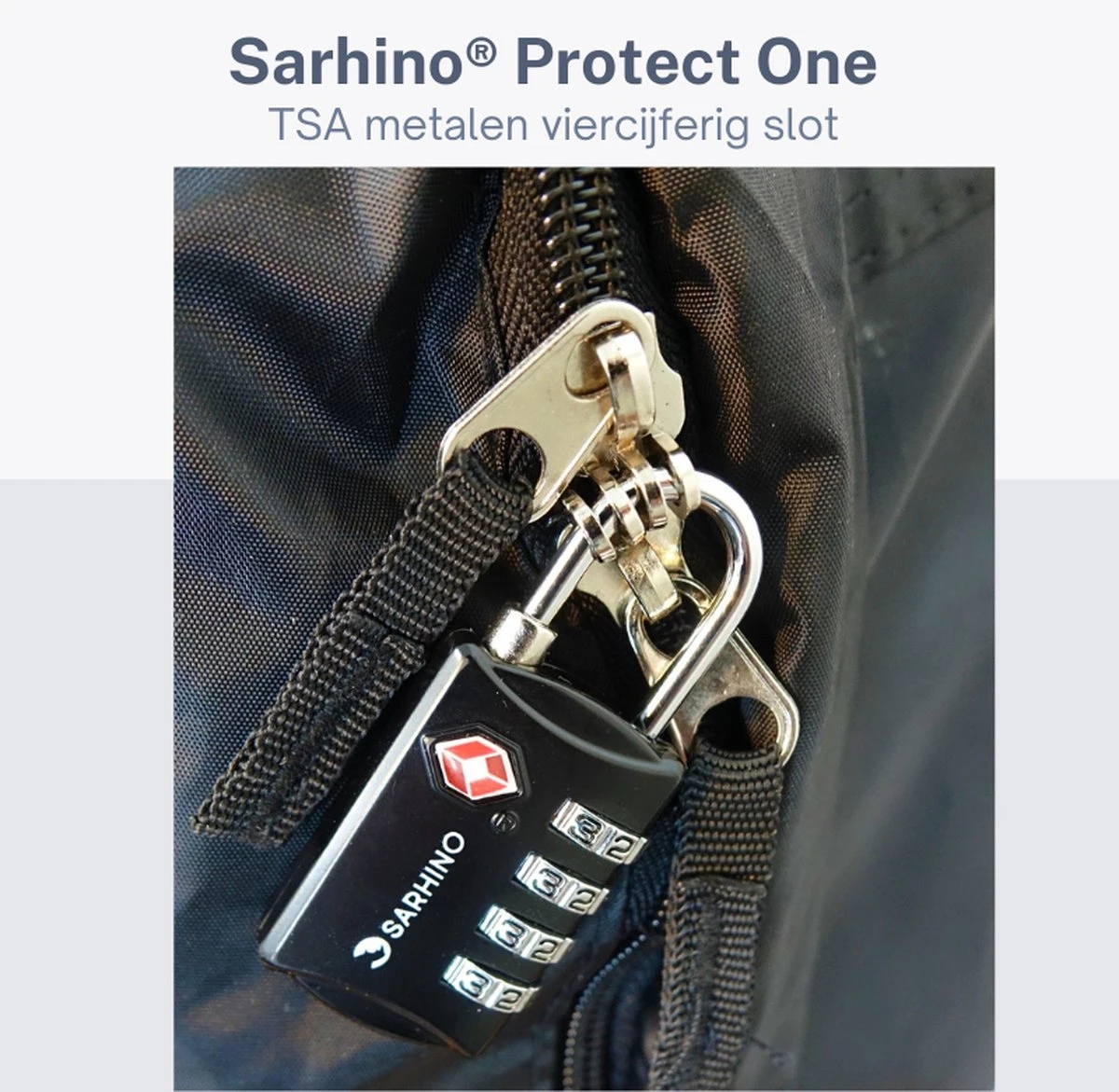 Dit metalen viercijferige slot van Sarhino zorgt voor extra bescherming van al jouw waardevolle spullen tijdens je reis. Hang het Sarhino Protect One slot aan de ritssluiting van je koffer, backpack, rugzak of transporthoes en sluit hem volledig af.