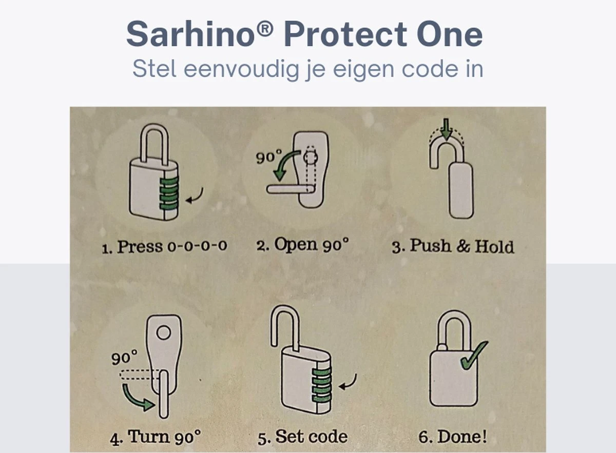 Dankzij het viercijferige codesysteem van het Sarhino Protect One slot hoef jij je geen zorgen te maken over het kwijtraken van een sleuteltje. Je opent het slot eenvoudig met de persoonlijke viercijferige code, plaatst het slot door de ritssluiting en klikt hem op slot. Snel, simpel en veilig.